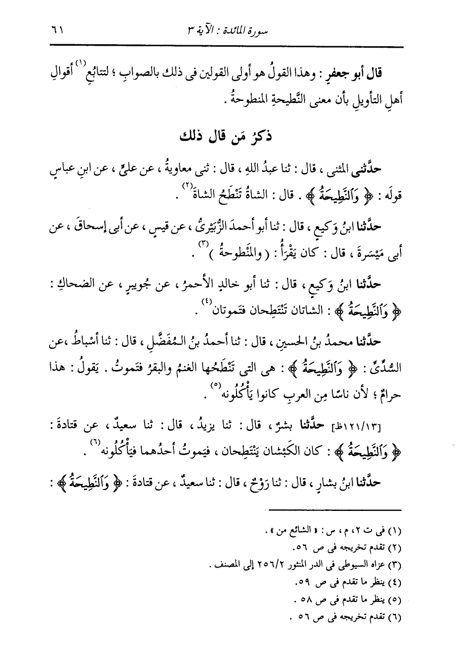 ذِكْرُ مَنْ قَالَ ذَلِكَ: حَدَّثَنِي الْمُثَنَّى , قَالَ ثنا عَبْدُ اللَّهِ , قَالَ: ثني مُعَاوِيَةُ , عَنْ عَلِيٍّ , عَنِ ابْنِ عَبَّاسٍ , قَوْلُهُ: {§وَالنَّطِيحَةُ} [المائدة: 3] قَالَ: «الشَّاةُ تَنْطِحُ الشَّاةَ»