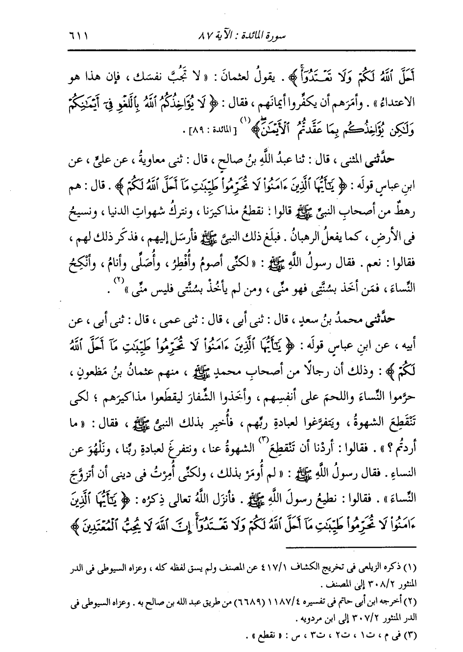 حَدَّثَنِي الْمُثَنَّى، قَالَ: ثنا عَبْدُ اللَّهِ بْنُ صَالِحٍ، قَالَ: ثني مُعَاوِيَةُ، عَنْ عَلِيٍّ، عَنِ ابْنِ عَبَّاسٍ، قَوْلُهُ: {يَا أَيُّهَا الَّذِينَ آمَنُوا لَا تُحَرِّمُوا طَيِّبَاتِ مَا أَحَلَّ اللَّهُ لَكُمْ} [المائدة: 87] قَالَ: هَمَّ رَهْطٌ مِنْ أَصْحَابِ النَّبِيِّ صَلَّى اللهُ عَلَيْهِ وَسَلَّمَ قَالُوا: نَقْطَعُ مَذَاكِيرَنَا، وَنَتْرُكُ شَهَوَاتِ الدُّنْيَا. وَنَسِيحُ فِي الْأَرْضِ كَمَا تَفْعَلُ الرُّهْبَانُ. فَبَلَغَ ذَلِكَ النَّبِيَّ صَلَّى اللهُ عَلَيْهِ وَسَلَّمَ، فَأَرْسَلَ إِلَيْهِمْ فَذَكَرَ ذَلِكَ لَهُمْ. فَقَالُوا: نَعَمْ، فَقَالَ رَسُولُ اللَّهِ صَلَّى اللهُ عَلَيْهِ وَسَلَّمَ: «§لَكِنِّي أَصُومُ وَأُفْطِرُ، وَأُصَلِّي وَأَنَامُ، وَأَنْكَحُ النِّسَاءَ، فَمَنْ أَخَذَ بِسُنَّتِي فَهُوَ مِنِّي، وَمَنْ لَمْ يَأْخُذْ بِسُنَّتِي فَلَيْسَ مِنِّي»