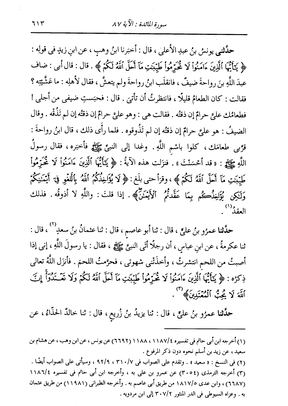 حَدَّثَنَا عَمْرُو بْنُ عَلِيٍّ، قَالَ: ثنا أَبُو عَاصِمٍ، قَالَ: ثنا عُثْمَانُ بْنُ سَعِيدٍ، قَالَ: ثنا عِكْرِمَةُ، عَنِ ابْنِ عَبَّاسٍ، " §أَنَّ رَجُلًا أَتَى النَّبِيَّ صَلَّى اللهُ عَلَيْهِ وَسَلَّمَ فَقَالَ: يَا رَسُولَ اللَّهِ، إِنِّي إِذَا أَصَبْتُ مِنَ اللَّحْمِ انْتَشَرْتُ وَأَخَذَتْنِي شَهْوَتِي، فَحَرَّمْتُ اللَّحْمَ. فَأَنْزَلَ اللَّهُ تَعَالَى ذِكْرُهُ: {يَا أَيُّهَا الَّذِينَ آمَنُوا لَا تُحَرِّمُوا طَيِّبَاتِ مَا أَحَلَّ اللَّهُ لَكُمْ وَلَا تَعْتَدُوا إِنَّ اللَّهَ لَا يُحِبُّ الْمُعْتَدِينَ} [المائدة: 87]