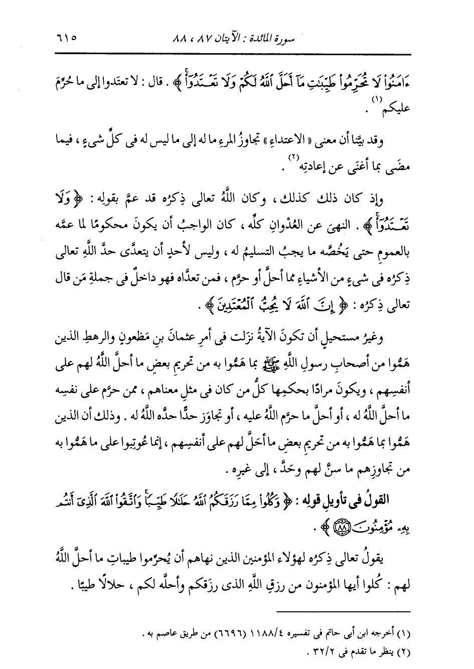 آمَنُوا لَا تُحَرِّمُوا طَيِّبَاتِ مَا أَحَلَّ اللَّهُ لَكُمْ وَلَا تَعْتَدُوا} [المائدة: 87] ، قَالَ: «§لَا تَعْتَدُوا إِلَى مَا حُرِّمَ عَلَيْكُمْ» وَقَدْ بَيَّنَّا أَنَّ مَعْنَى الِاعْتِدَاءِ: تَجَاوَزُ الْمَرْءِ مَالَهُ إِلَى مَا لَيْسَ لَهُ فِي كُلِّ شَيْءٍ، فِيمَا مَضَى بِمَا أَغْنَى عَنْ إِعَادَتِهِ. وَإِذْ كَانَ ذَلِكَ كَذَلِكَ، وَكَانَ اللَّهُ تَعَالَى ذِكْرُهُ قَدْ عَمَّ بِقَوْلِهِ: {لَا تَعْتَدُوا} [البقرة: 190] النَّهْيَ عَنِ الْعُدْوَانِ كُلِّهِ، كَانَ الْوَاجِبُ أَنْ يَكُونَ مَحْكُومًا لِمَا عَمَّهُ بِالْعُمُومِ حَتَّى يَخُصَّهُ مَا يَجِبُ التَّسْلِيمُ لَهُ. وَلَيْسَ لِأَحَدٍ أَنْ يَتَعَدَّى حَدَّ اللَّهِ تَعَالَى فِي شَيْءٍ مِنَ الْأَشْيَاءِ مِمَّا أَحَلَّ أَوْ حَرَّمَ، فَمَنْ تَعَدَّاهُ فَهُوَ دَاخِلٌ فِي جُمْلَةِ مَنْ قَالَ تَعَالَى ذِكْرُهُ: {إِنَّ اللَّهَ لَا يُحِبُّ الْمُعْتَدِينَ} [البقرة: 190] ، وَغَيْرُ مُسْتَحِيلٌ أَنْ تَكُونَ الْآيَةُ نَزَلَتْ فِي أَمْرِ عُثْمَانَ بْنِ مَظْعُونٍ وَالرَّهْطِ الَّذِينَ هَمُّوا مِنْ أَصْحَابِ رَسُولِ اللَّهِ صَلَّى اللهُ عَلَيْهِ وَسَلَّمَ بِمَا هَمُّوا بِهِ مِنْ تَحْرِيمِ بَعْضِ مَا أَحَلَّ اللَّهُ لَهُمْ عَلَى أَنْفُسِهِمْ، وَيَكُونُ مُرَادًا بِحُكْمِهَا كُلَّ مَنْ كَانَ فِي مِثْلِ مَعْنَاهُمْ مِمَّنْ حَرَّمَ عَلَى نَفْسِهِ مَا أَحَلَّ اللَّهُ لَهُ، أَوْ أَحَلَّ مَا حَرَّمَ اللَّهُ عَلَيْهِ، أَوْ تَجَاوَزَ حَدًّا حَدَّهُ اللَّهُ لَهُ، وَذَلِكَ أَنَّ الَّذِينَ هَمُّوا بِمَا هَمُّوا بِهِ مِنْ تَحْرِيمِ بَعْضِ مَا أَحَلَّ لَهُمْ عَلَى أَنْفُسِهِمْ إِنَّمَا عُوتِبُوا عَلَى مَا هَمُّوا بِهِ مِنْ تَجَاوِزِهِمْ مَا سَنَّ لَهُمْ وَحَّدَ إِلَى غَيْرِهِ