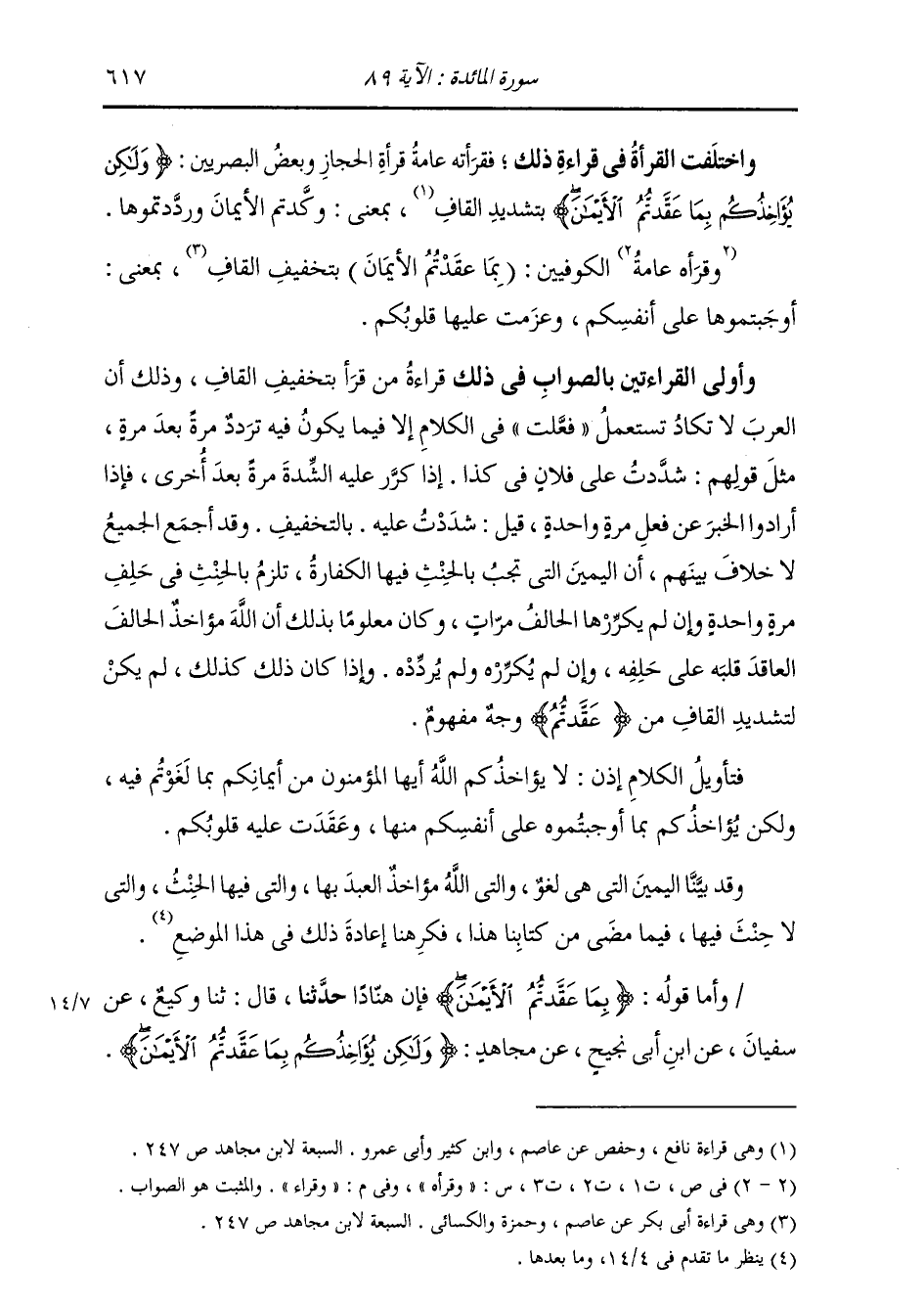 §وَأَمَّا قَوْلُهُ: {بِمَا عَقَّدْتُمُ الْأَيْمَانَ} [المائدة: 89] فَإِنَّ: