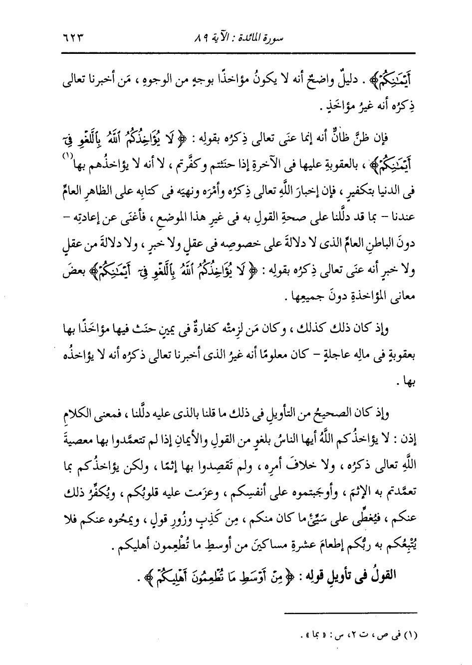 أَيْمَانِكُمْ} [البقرة: 225] دَلِيلٌ وَاضِحٌ أَنَّهُ لَا يَكُونُ مُؤَاخَذًا بِوَجْهٍ مِنَ الْوُجُوهِ مَنْ أَخْبَرَنَا تَعَالَى ذِكْرُهُ أَنَّهُ غَيْرُ مُؤَاخَذٍ. فَإِنْ ظَنَّ ظَانٌّ أَنَّهُ إِنَّمَا عَنَى تَعَالَى ذِكْرُهُ بِقَوْلِهِ: {لَا يُؤَاخِذُكُمُ اللَّهُ بِاللَّغْوِ فِي أَيْمَانِكُمْ} [البقرة: 225] بِالْعُقُوَبَةِ عَلَيْهَا فِي الْآخِرَةِ إِذَا حَنَثْتُمْ وَكَفَّرْتُمْ، لَا أَنَّهُ لَا يُؤَاخِذُهُمُ بِهَا فِي الدُّنْيَا بِتَكْفِيرٍ فَإِنَّ إِخْبَارَ اللَّهِ تَعَالَى ذِكْرُهُ وَأَمْرَهُ وَنَهْيَهُ فِي كِتَابِهِ عَلَى الظَّاهِرِ الْعَامِّ عِنْدَنَا بِمَا قَدْ دَلَّلْنَا عَلَى صِحَّةِ الْقَوْلِ بِهِ فِي غَيْرِ هَذَا الْمَوْضِعِ فَأَغْنَى عَنْ إِعَادَتِهِ، دُونَ الْبَاطِنِ الْعَامِّ الَّذِي لَا دَلَالَةَ عَلَى خُصُوصِهِ فِي عَقْلٍ وَلَا خَبَرٍ، وَلَا دَلَالَةَ مِنْ عَقْلٍ وَلَا خَبَرٍ أَنَّهُ عَنَى تَعَالَى ذِكْرُهُ بِقَوْلِهِ: {لَا يُؤَاخِذُكُمُ اللَّهُ بِاللَّغْوِ فِي أَيْمَانِكُمْ} [البقرة: 225] بَعْضَ مَعَانِي الْمَؤَاخَذَةِ دُونَ جَمِيعِهَا. وَإِذْ كَانَ ذَلِكَ كَذَلِكَ، وَكَانَ مَنْ لَزِمَتْهُ كَفَّارَةٌ فِي يَمِينٍ حَنِثَ فِيهَا مَؤَاخَذًا بِهَا بِعُقُوبَةٍ فِي مَالِهِ عَاجِلَةٍ، كَانَ مَعْلُومًا أَنَّهُ غَيْرُ الَّذِي أَخْبَرَنَا تَعَالَى ذِكْرُهُ أَنَّهُ لَا يُؤَاخِذُهُ بِهَا. وَإِذَا كَانَ الصَّحِيحُ مِنَ التَّأْوِيلِ فِي ذَلِكَ مَا قُلْنَا بِالَّذِي عَلَيْهِ دَلَّلْنَا، فَمَعْنَى الْكَلَامِ إِذَنْ: لَا يُؤَاخِذُكُمُ اللَّهُ أَيُّهَا النَّاسُ بِلَغْو مِنَ الْقَوْلِ وَالْأَيْمَانِ إِذَا لَمْ تَتَعَمَّدُوا بِهَا مَعْصِيَةَ اللَّهِ تَعَالَى وَلَا خِلَافَ أَمْرِهِ، وَلَمْ تَقْصِدُوا بِهَا إِثْمًا، وَلَكِنْ يُؤَاخِذُكُمْ بِمَا تَعَمَّدْتُمْ بِهِ الْإِثْمَ وَأَوْجَبْتُمُوهُ عَلَى أَنْفُسِكُمْ وَعَزَمَتْ عَلَيْهِ قُلُوبُكُمْ، وَيُكَفِّرُ ذَلِكَ عَنْكُمْ، فُيُغَطِّي عَلَى سَيِّئِ مَا كَانَ مِنْكُمْ مِنْ كَذِبٍ وَزُورِ قَوْلٍ، وَيَمْحُوهُ عَنْكُمْ فَلَا يَتَّبِعْكُمْ بِهِ رَبُّكُمْ، إِطْعَامُ عَشَرَةِ مَسَاكِينَ مِنْ أَوْسَطِ مَا تُطْعِمُونَ أَهْلِيكُمْ