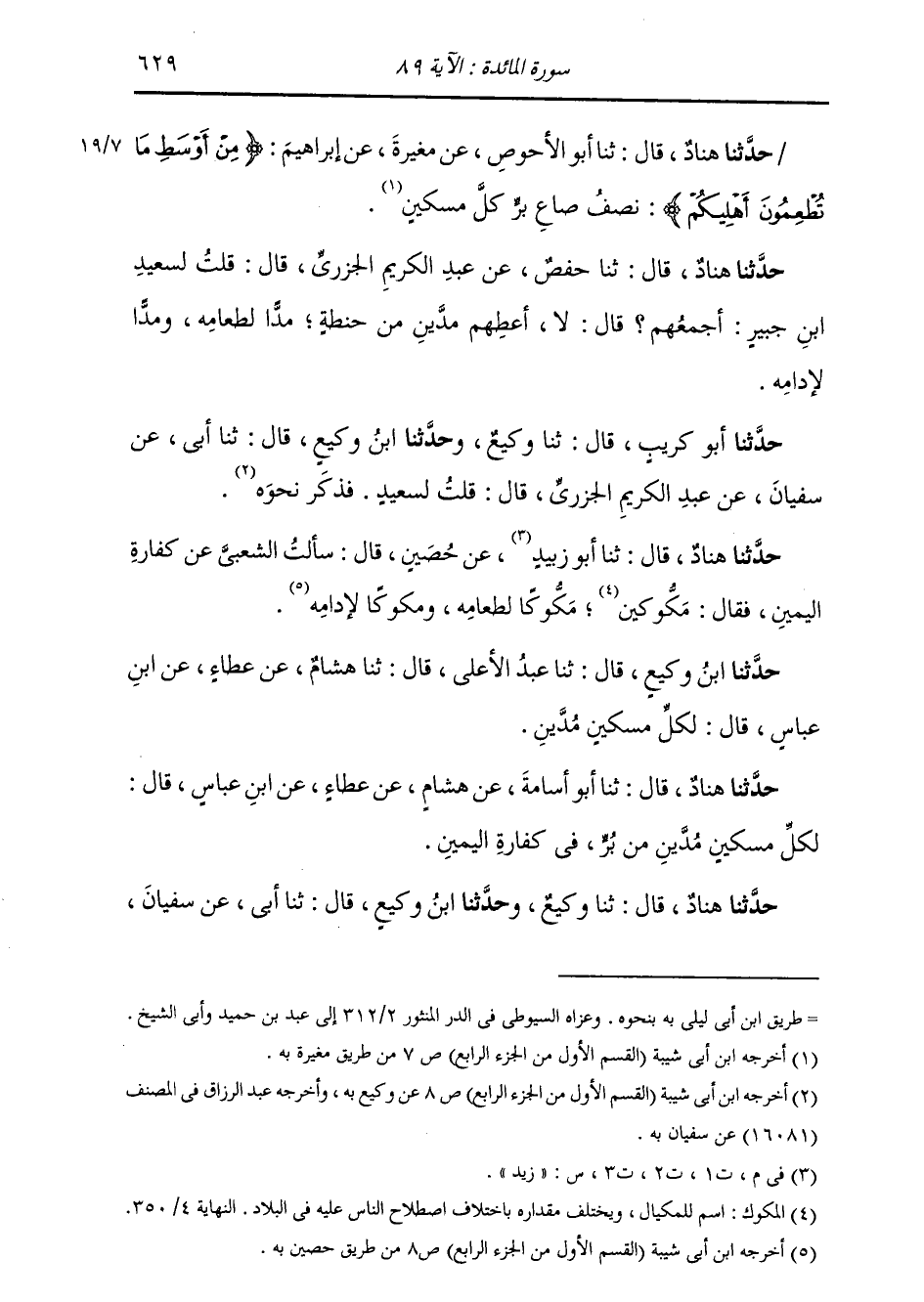 حَدَّثَنَا هَنَّادٌ، قَالَ: ثنا حَفْصٌ، عَنْ عَبْدِ الْكَرِيمِ الْجَزَرِيِّ، قَالَ: قُلْتُ لِسَعِيدِ بْنِ جُبَيْرٍ: أَجْمَعُهُمْ؟ قَالَ: «لَا §أَعْطِهِمْ مُدَّيْنِ مِنْ حِنْطَةٍ، مُدًّا لِطَعَامِهِ وَمُدًّا لِإِدَامِهِ» حَدَّثَنَا أَبُو كُرَيْبٍ قَالَ: ثنا وَكِيعٌ، وَحَدَّثَنَا ابْنُ وَكِيعٍ قَالَ: ثنا أَبِي، عَنْ سُفْيَانَ، عَنْ عَبْدِ الْكَرِيمِ الْجَزَرِيِّ قَالَ: قُلْتُ لِسَعِيدٍ، فَذَكَرَ نَحْوَهُ