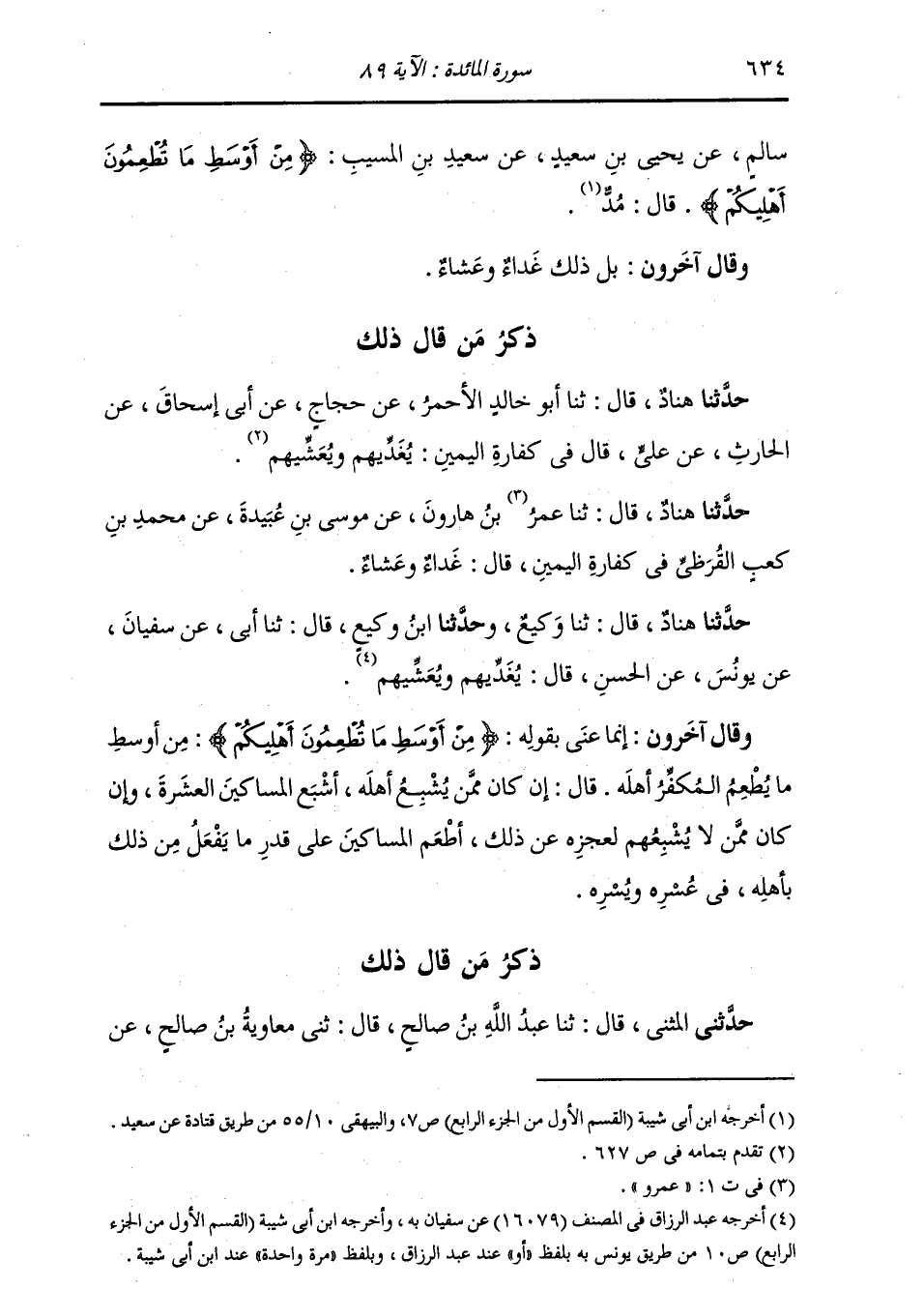 ذِكْرُ مَنْ قَالَ ذَلِكَ حَدَّثَنِي الْمُثَنَّى، قَالَ: ثنا عَبْدُ اللَّهِ بْنُ صَالِحٍ، قَالَ: ثني مُعَاوِيَةُ بْنُ صَالِحٍ، عَنْ -[635]- عَلِيِّ بْنِ أَبِي طَلْحَةَ، عَنِ ابْنِ عَبَّاسٍ، قَوْلُهُ: {فَكَفَّارَتُهُ إِطْعَامُ عَشَرَةِ مَسَاكِينَ مِنْ أَوْسَطِ مَا تُطْعِمُونَ أَهْلِيكُمْ} [المائدة: 89] قَالَ: «§إِنْ كُنْتَ تُشْبِعُ أَهْلَكَ فَأَشْبِعِ الْمَسَاكِينَ، وَإِلَّا فَعَلَى مَا تُطْعِمُ أَهْلَكَ بِقَدْرِهِ»