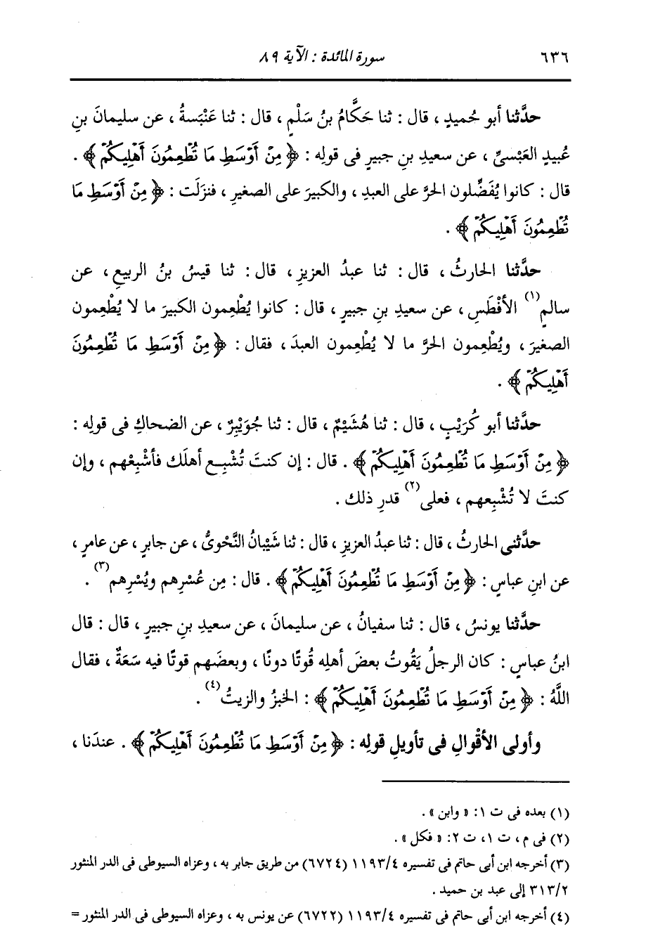 حَدَّثَنَا أَبُو حُمَيْدٍ، قَالَ: ثنا حَكَّامُ بْنُ سَلْمٍ، قَالَ: ثنا عَنْبَسَةُ، عَنْ سُلَيْمَانَ بْنِ عُبَيْدٍ الْعَبْسِيِّ، عَنْ سَعِيدِ بْنِ جُبَيْرٍ، فِي قَوْلِهِ: {مِنْ أَوْسَطِ مَا تُطْعِمُونَ أَهْلِيكُمْ} [المائدة: 89] قَالَ: " §كَانُوا يُفَضِّلُونَ الْحُرَّ عَلَى الْعَبْدِ وَالْكَبِيرَ عَلَى الصَّغِيرِ، فَنَزَلَتْ: {مِنْ أَوْسَطِ مَا تُطْعِمُونَ أَهْلِيكُمْ} [المائدة: 89]