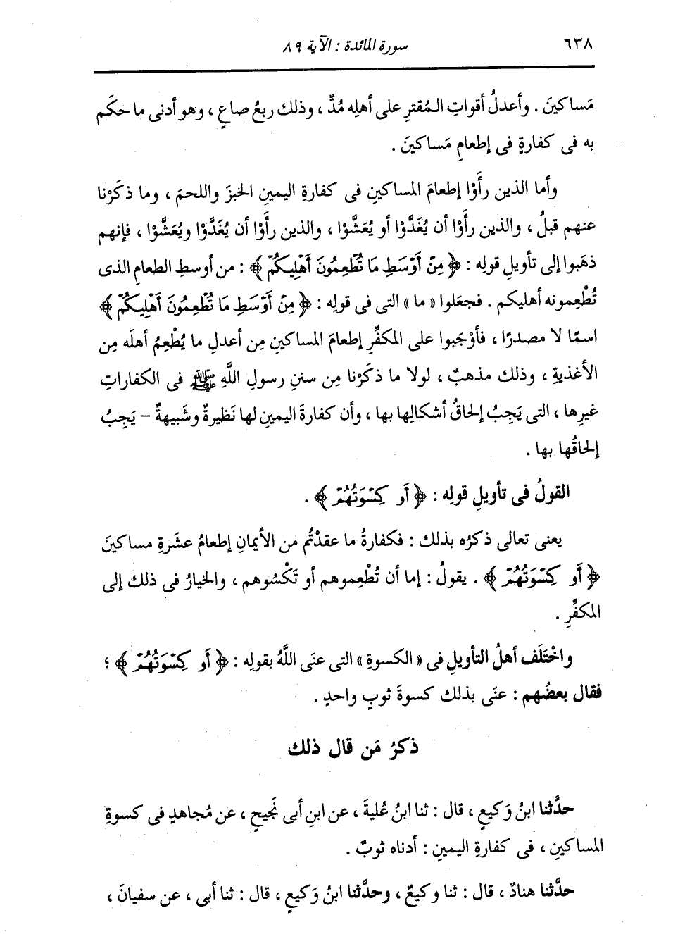 §الْقَوْلُ فِي تَأْوِيلِ قَوْلِهِ تَعَالَى: {أَوْ كِسْوَتُهُمْ} [المائدة: 89] يَعْنِي تَعَالَى ذِكْرُهُ بِذَلِكَ: فَكَفَّارَةُ مَا عَقَّدْتُمْ مِنَ الْأَيْمَانِ إِطْعَامُ عَشَرَةِ مَسَاكِينَ أَوْ كِسْوَتُهُمْ. يَقُولُ إِمَّا أَنْ تُطْعِمُوهُمُ أَوْ تَكْسُوهُمْ، وَالْخِيَارُ فِي ذَلِكَ إِلَى الْمُكَفِّرِ. وَاخْتَلَفَ أَهْلُ التَّأْوِيلِ فِي الْكِسْوَةِ الَّتِي عَنَى اللَّهُ بِقَوْلِهِ: {أَوْ كِسْوَتُهُمْ} [المائدة: 89] ، فَقَالَ بَعْضُهُمْ: عَنَى بِذَلِكَ كِسْوَةَ ثَوْبٍ وَاحِدٍ