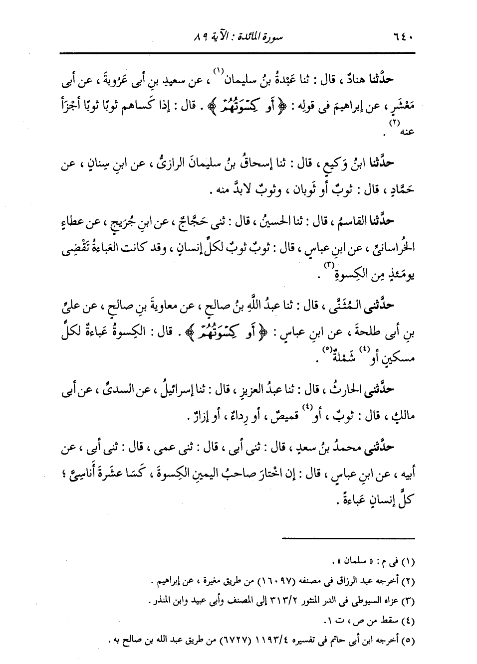 حَدَّثَنِي الْمُثَنَّى قَالَ: ثنا عَبْدُ اللَّهِ بْنُ صَالِحٍ، عَنْ مُعَاوِيَةَ بْنِ صَالِحٍ، عَنْ عَلِيِّ بْنِ أَبِي طَلْحَةَ، عَنِ ابْنِ عَبَّاسٍ: {أَوْ كِسْوَتُهُمْ} [المائدة: 89] قَالَ: " §الْكِسْوَةُ: عَبَاءَةٌ لِكُلِّ مِسْكِينٍ أَوْ شَمْلَةٌ "