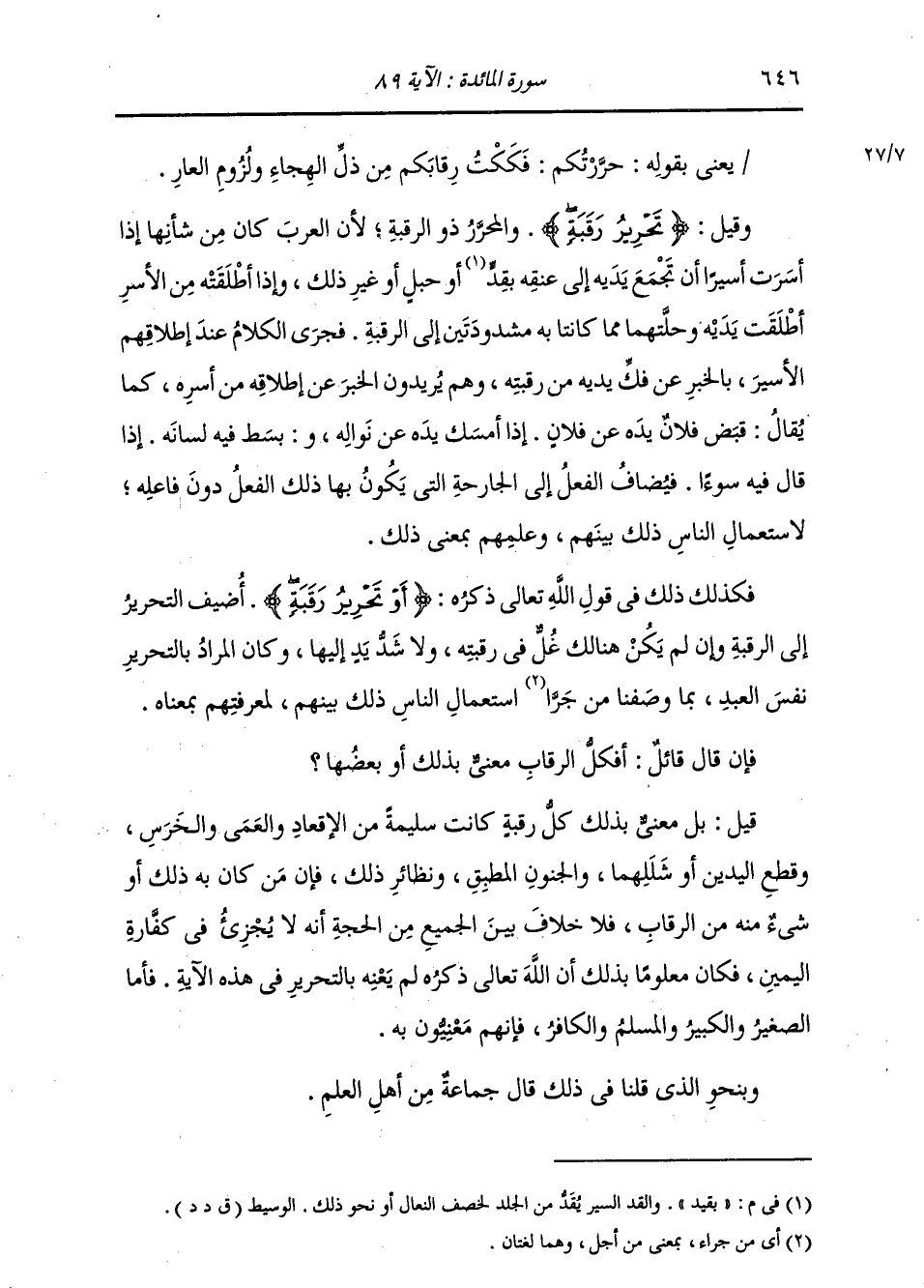 يَعْنِي بِقَوْلِهِ: حَرَّرْتُكُمْ: فَكَكْتُ رِقَابَكُمْ مِنْ ذُلِّ الْهِجَاءَ وَلُزُومِ الْعَارِ. وَقِيلَ: تَحْرِيرُ رَقَبَةٍ، وَالْمُحَرَّرُ صَاحِبُ الرَّقَبَةِ، لِأَنَّ الْعَرَبَ كَانَ مِنْ شَأْنِهَا إِذَا أَسَرَتْ أَسِيرًا أَنْ تَجْمَعَ يَدَيْهِ إِلَى عُنُقِهِ بِقَيْدٍ أَوْ حَبْلٍ أَوْ غَيْرِ ذَلِكَ، وَإِذَا أَطْلَقَتْهُ مِنَ الْأَسْرِ أَطْلَقَتْ يَدَيْهِ وَحَلَّتْهُمَا مِمَّا كَانَتَا بِهِ مَشْدُودَتَيْنِ إِلَى الرَّقَبَةِ. فَجَرَى الْكَلَامُ عِنْدَ إِطْلَاقِهِمُ الْأَسِيرَ، بِالْخَبَرِ عَنْ فَكِّ يَدَيْهِ عَنْ رَقَبَتِهِ، وَهُمْ يُرِيدُونَ الْخَبَرَ عَنْ إِطْلَاقِهِ مِنْ أَسْرِهِ، كَمَا يُقَالُ: قَبَضَ فُلَانٌ يَدَهُ عَنْ فُلَانٍ: إِذَا أَمْسَكَ يَدَهُ عَنْ نَوْالِهِ، وَبَسَطَ فِيهِ لِسَانَهُ: إِذَا قَالَ فِيهِ سُوءًا، فَيُضَافُ الْفِعْلُ إِلَى الْجَارِحَةِ الَّتِي يَكُونُ بِهَا ذَلِكَ الْفِعْلُ دُونَ فَاعِلِهِ، لِاسْتِعْمَالِ النَّاسِ ذَلِكَ بَيْنَهُمْ وَعِلْمِهِمْ بِمَعْنَى ذَلِكَ. فَكَذَلِكَ ذَلِكَ فِي قَوْلِ اللَّهِ تَعَالَى ذِكْرُهُ: {أَوْ تَحْرِيرُ رَقَبَةٍ} [المائدة: 89] أُضِيفَ التَّحْرِيرُ إِلَى الرَّقَبَةِ وَإِنْ لَمْ يَكُنْ هُنَاكَ غُلٌّ فِي رَقَبَتِهِ وَلَا شَدُّ يَدٍ إِلَيْهَا، وَكَانَ الْمُرَادُ بِالتَّحْرِيرِ نَفْسَ الْعَبْدِ بِمَا وَصَفْنَا مِنْ جَرَّى اسْتِعْمَالِ النَّاسِ ذَلِكَ بَيْنَهُمْ لِمَعْرِفَتِهِمْ بِمَعْنَاهُ. فَإِنْ قَالَ قَائِلٌ: أَفَكُلُّ الرِّقَابِ مَعْنِيُّ بِذَلِكَ أَوْ بَعْضُهَا؟ قِيلَ: بَلْ مَعْنِيُّ بِذَلِكَ كُلُّ رَقَبَةٍ كَانَتْ سَلِيمَةً مِنَ الْإِقْعَادِ وَالْعَمَى وَالْخَرَسِ وَقَطْعِ الْيَدَيْنِ أَوْ شَلَلِهِمَا وَالْجُنُونِ الْمُطْبِقِ وَنَظَائِرِ ذَلِكَ، فَإِنَّ مَنْ كَانَ بِهِ ذَلِكَ أَوْ شَيْءٌ مِنْهُ مِنَ الرِّقَابِ، فَلَا خِلَافَ بَيْنَ الْجَمِيعِ مِنَ الْحُجَّةِ أَنَّهُ لَا يَجْزِي فِي كَفَّارَةِ الْيَمِينِ. فَكَانَ مَعْلُومًا بِذَلِكَ أَنَّ اللَّهَ تَعَالَى ذِكْرُهُ لَمْ يَعْنِهِ بِالتَّحْرِيرِ فِي هَذِهِ الْآيَةِ. فَأَمَّا الصَّغِيرُ وَالْكَبِيرُ وَالْمُسْلِمُ وَالْكَافِرُ، فَإِنَّهُمْ مَعْنِيُّونَ بِهِ وَبِنَحْوِ الَّذِي قُلْنَا فِي ذَلِكَ قَالَ جَمَاعَةٌ مِنْ أَهْلِ الْعِلْمِ