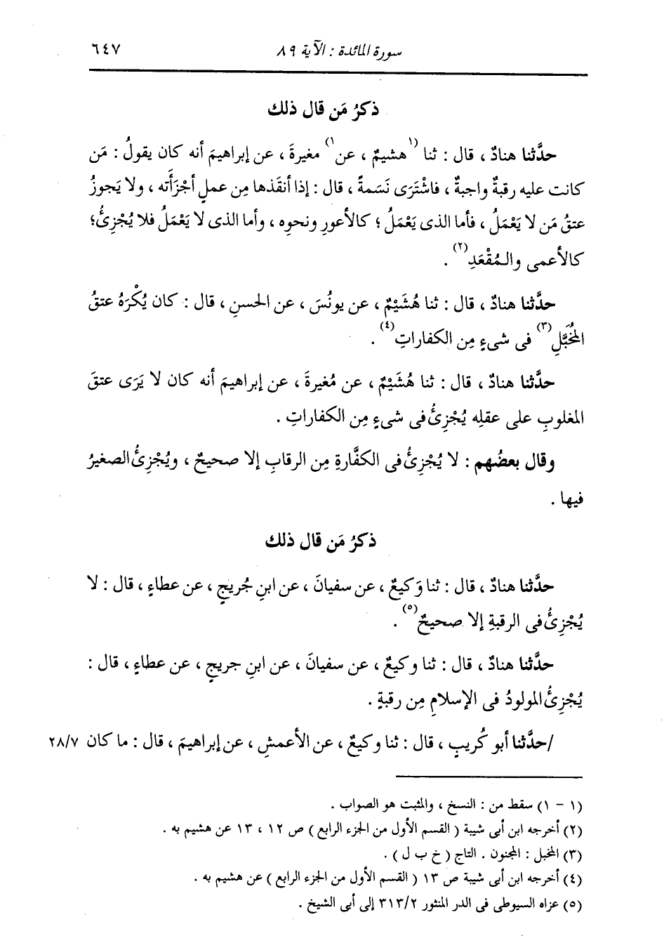 حَدَّثَنَا هَنَّادٌ، قَالَ: ثنا هُشَيْمٌ، عَنْ مُغِيرَةَ، عَنْ إِبْرَاهِيمَ، «§أَنَّهُ كَانَ لَا يَرَى عِتْقَ الْمَغْلُوبِ عَلَى عَقْلِهِ يُجْزِئُ فِي شَيْءٍ مِنَ الْكَفَّارَاتِ» وَقَالَ بَعْضُهُمْ: لَا يُجْزِئُ فِي الْكَفَّارَةِ مِنَ الرِّقَابِ إِلَّا صَحِيحٌ، وَيُجْزِئُ الصَّغِيرُ فِيهَا