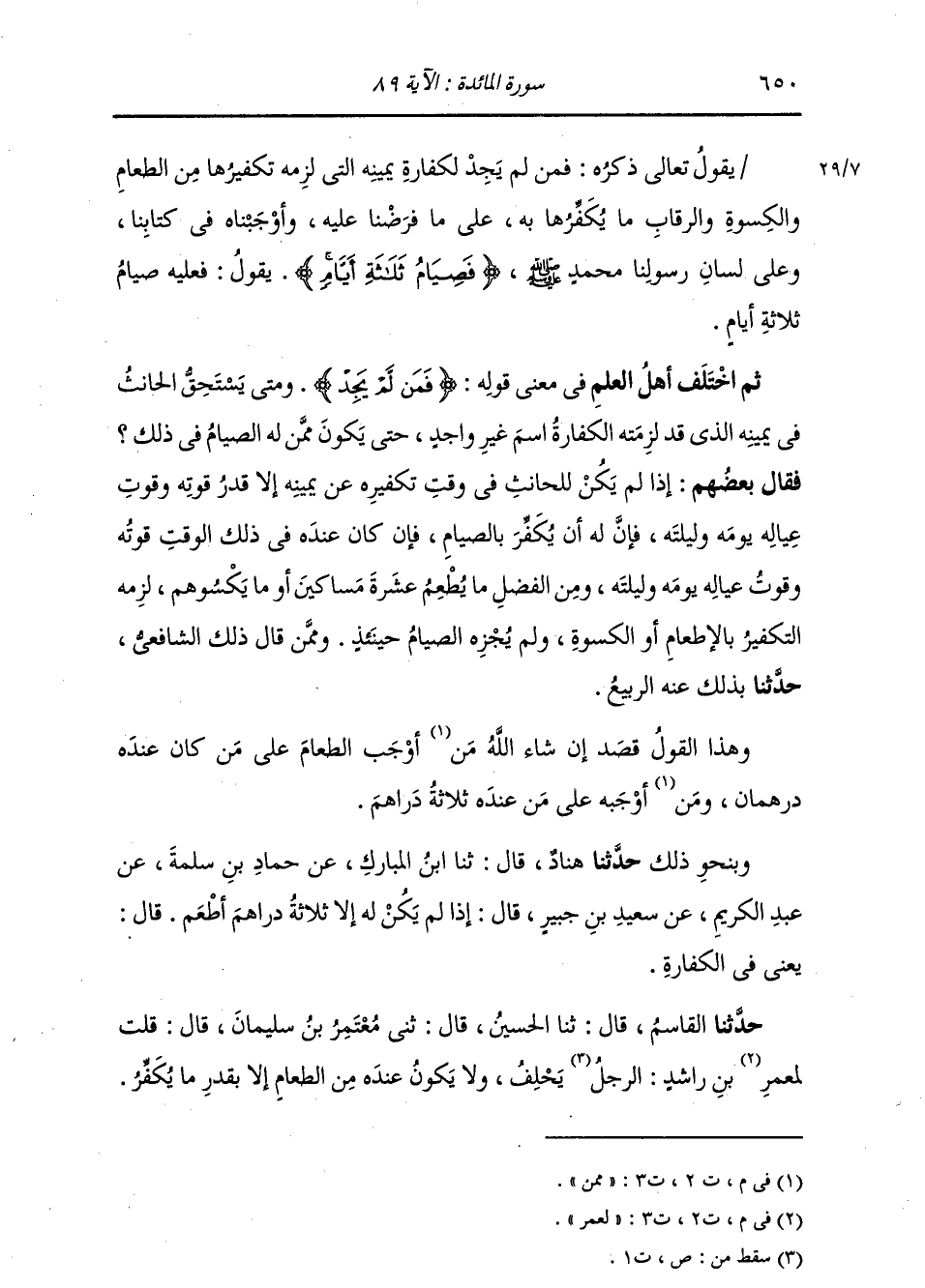 حَدَّثَنَا الْقَاسِمُ، قَالَ: ثنا الْحُسَيْنُ، قَالَ: ثني مُعْتَمِرُ بْنُ سُلَيْمَانَ، قَالَ: قُلْتُ لِعُمَرَ بْنِ رَاشِدٍ: الرَّجُلُ يَحْلِفُ وَلَا يَكُونُ عِنْدَهُ مِنَ الطَّعَامِ إِلَّا بِقَدْرِ مَا يُكَفِّرُ؟ -[651]- قَالَ: كَانَ قَتَادَةُ يَقُولُ: «§يَصُومُ ثَلَاثَةَ أَيَّامٍ»