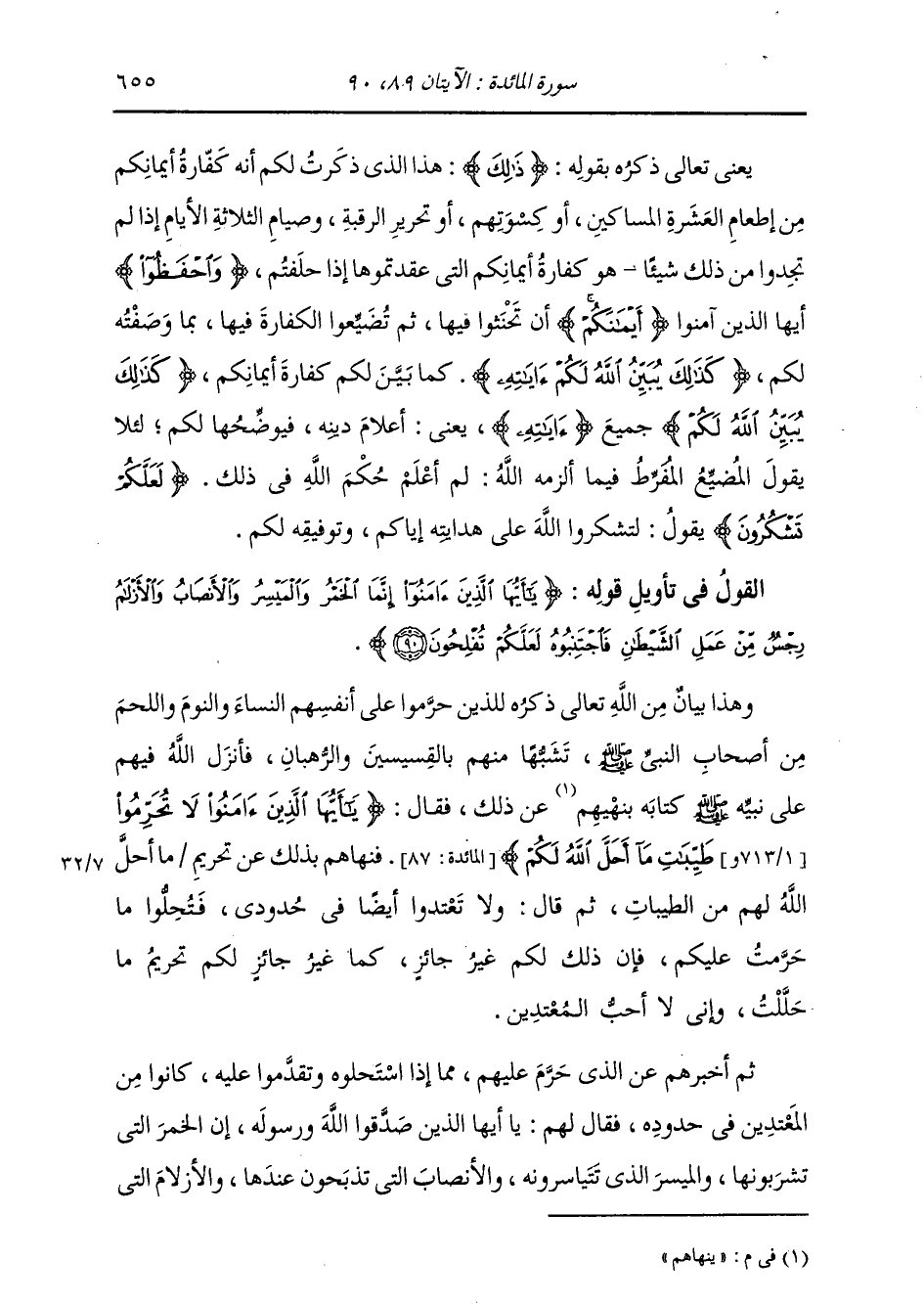 §الْقَوْلُ فِي تَأْوِيلِ قَوْلِهِ تَعَالَى: {يَا أَيُّهَا الَّذِينَ آمَنُوا إِنَّمَا الْخَمْرُ وَالْمَيْسِرُ وَالْأَنْصَابُ وَالْأَزْلَامُ رِجْسٌ مِنْ عَمَلِ الشَّيْطَانِ فَاجْتَنِبُوهُ لَعَلَّكُمْ تُفْلِحُونَ} [المائدة: 90] وَهَذَا بَيَانٌ مِنَ اللَّهِ تَعَالَى ذِكْرُهُ لِلَّذِينَ حَرَّمُوا عَلَى أَنْفُسِهِمُ النِّسَاءَ وَالنَّوْمَ وَاللَّحْمَ مِنْ أَصْحَابِ النَّبِيِّ صَلَّى اللهُ عَلَيْهِ وَسَلَّمَ تَشَبُّهًا مِنْهُمْ بِالْقِسِّيسِينَ وَالرُّهْبَانِ، فَأَنْزَلَ اللَّهُ فِيهِمْ عَلَى نَبِيِّهِ صَلَّى اللهُ عَلَيْهِ وَسَلَّمَ كِتَابَهُ يَنْهَاهُمْ عَنْ ذَلِكَ، فَقَالَ: {يَا أَيُّهَا الَّذِينَ آمَنُوا لَا تُحَرِّمُوا طَيِّبَاتِ مَا أَحَلَّ اللَّهُ لَكُمْ} [المائدة: 87] فَنَهَاهُمْ بِذَلِكَ عَنْ تَحْرِيمِ مَا أَحَلَّ اللَّهُ لَهُمْ مِنَ الطَّيِّبَاتِ. ثُمَّ قَالَ: وَلَا تَعْتَدُوا أَيْضًا فِي حِدُودِي، فَتُحِلُّوا مَا حَرَّمْتُ عَلَيْكُمْ، فَإِنَّ ذَلِكَ لَكُمْ غَيْرُ جَائِزٍ كَمَا غَيْرُ جَائِزٍ لَكُمْ تَحْرِيمُ مَا حَلَلْتُ، وَإِنِّي لَا أُحِبُّ الْمُعْتَدِينَ. ثُمَّ أَخْبَرَهُمْ عَنِ الَّذِي حَرَّمَ عَلَيْهِمْ مِمَّا إِذَا اسْتَحَلُّوهُ وَتَقَدَّمُوا عَلَيْهِ كَانُوا مِنَ الْمُعْتَدِينَ فِي حُدُودِهِ، فَقَالَ لَهُمْ: يَا أَيُّهَا الَّذِينَ صَدَقُوا اللَّهَ وَرَسُولَهُ، إِنَّ الْخَمْرَ الَّتِي تَشْرَبُونَهَا، وَالْمَيْسِرَ الَّذِي تَتَيَاسَرُونَهُ، وَالْأَنْصَابَ الَّتِي تَذْبَحُونَ عِنْدَهَا، وَالْأَزْلَامَ الَّتِي
