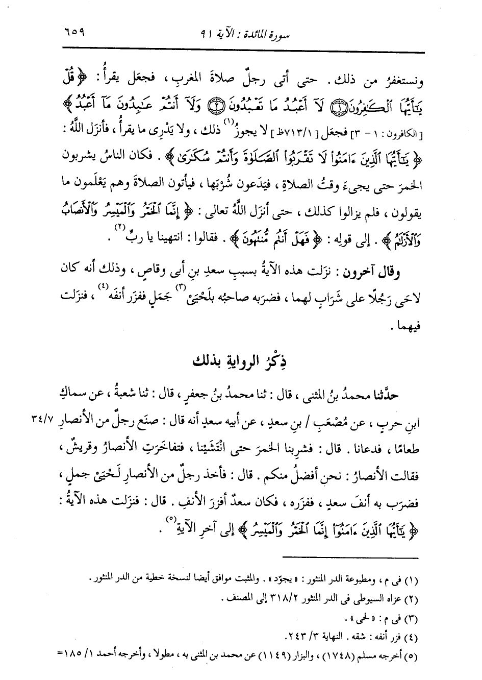 وَنَسْتَغْفِرُ مِنْ ذَلِكَ. حَتَّى أَتَى رَجُلٌ صَلَاةَ الْمَغْرِبِ، فَجَعَلَ يَقْرَأُ: قُلْ يَا أَيُّهَا الْكَافِرُونَ، أَعْبُدُ مَا تَعْبُدُونَ، وَلَا أَنْتُمْ عَابِدُونَ مَا أَعْبُدُ. فَجَعَلَ لَا يَجَوِّدُ ذَلِكَ وَلَا يَدْرِي مَا يَقْرَأُ، فَأَنْزَلَ اللَّهُ: {يَا أَيُّهَا الَّذِينَ آمَنُوا لَا تَقْرَبُوا الصَّلَاةَ وَأَنْتُمْ سُكَارَى} [النساء: 43] ، فَكَانَ النَّاسُ يَشْرَبُونَ الْخَمْرَ حَتَّى يَجِيءَ وَقْتُ الصَّلَاةِ فَيَدَعُونَ شُرْبَهَا، فَيَأْتُونَ الصَّلَاةَ وَهُمْ يَعْلَمُونَ مَا يَقُولُونَ. فَلَمْ يَزَالُوا كَذَلِكَ حَتَّى أَنْزَلَ اللَّهُ تَعَالَى: {إِنَّمَا الْخَمْرُ وَالْمَيْسِرُ وَالْأَنْصَابُ وَالْأَزْلَامُ} [المائدة: 90] إِلَى قَوْلِهِ: {فَهَلْ أَنْتُمْ مُنْتَهُونَ} [المائدة: 91] ، فَقَالُوا: انْتَهَيْنَا يَا رَبُّ " وَقَالَ آخَرُونَ: نَزَلَتْ هَذِهِ الْآيَةُ بِسَبَبِ سَعْدِ بْنِ أَبِي وَقَّاصٍ، وَذَلِكَ أَنَّهُ كَانَ لَاحَى رَجُلًا عَلَى شَرَابٍ لَهُمَا، فَضَرَبَهُ صَاحِبُهُ بِلَحْيِ جَمَلٍ، فَفَزَرَ أَنْفَهُ، فَنَزَلَتْ فِيهِمَا