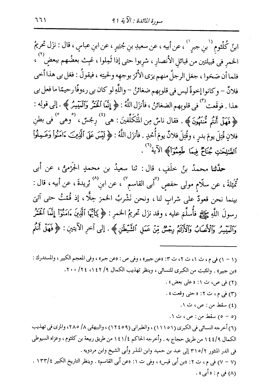 حَدَّثَنَا مُحَمَّدُ بْنُ خَلَفٍ، قَالَ: ثنا سَعِيدُ بْنُ مُحَمَّدٍ الْجَرْمِيُّ، عَنْ أَبِي تُمَيْلَةَ، عَنْ سَلَّامٍ، مَوْلَى حَفْصِ بْنِ أَبِي قَيْسٍ، عَنْ أَبِي بُرَيْدَةَ، عَنْ أَبِيهِ، قَالَ: " §بَيْنَمَا نَحْنُ قُعُودٌ عَلَى شَرَابٍ لَنَا وَنَحْنُ نَشْرَبُ الْخَمْرَ حِلًّا، إِذْ قُمْتُ حَتَّى آتِيَ رَسُولَ اللَّهِ صَلَّى اللهُ عَلَيْهِ وَسَلَّمَ فَأُسَلِّمَ عَلَيْهِ، وَقَدْ نَزَلَ تَحْرِيمُ الْخَمْرِ: {يَا أَيُّهَا الَّذِينَ آمَنُوا إِنَّمَا الْخَمْرُ وَالْمَيْسِرُ وَالْأَنْصَابُ وَالْأَزْلَامُ رِجْسٌ مِنْ عَمَلِ الشَّيْطَانِ} [المائدة: 90] إِلَى آخِرِ الْآيَتَيْنِ: {فَهَلْ أَنْتُمْ