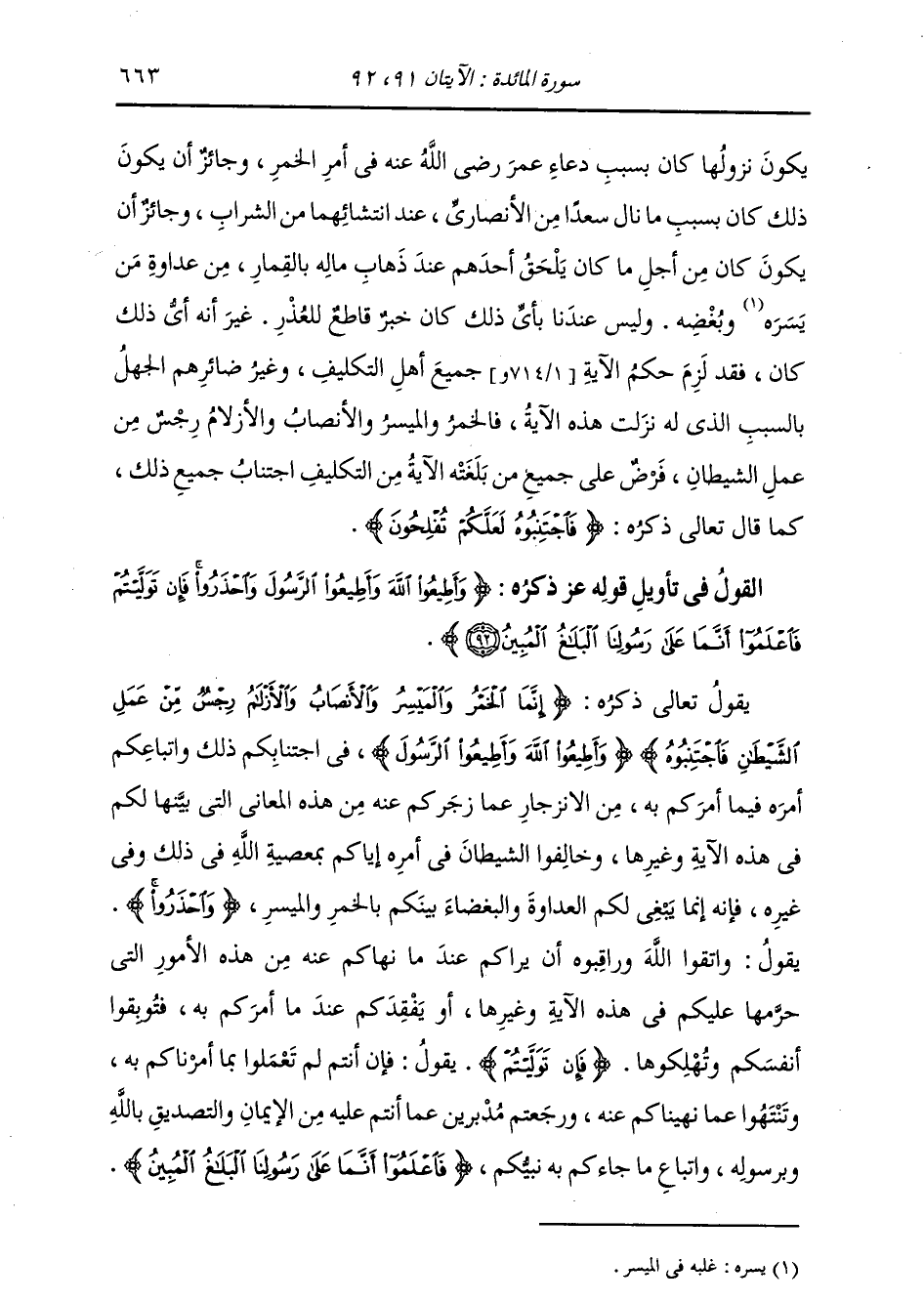 §الْقَوْلُ فِي تَأْوِيلِ قَوْلِهِ تَعَالَى: {وَأَطِيعُوا اللَّهَ وَأَطِيعُوا الرَّسُولَ وَاحْذَرُوا فَإِنْ تَوَلَّيْتُمْ فَاعْلَمُوا أَنَّمَا عَلَى رَسُولِنَا الْبَلَاغُ الْمُبِينُ} [المائدة: 92] يَقُولُ تَعَالَى ذِكْرُهُ: إِنَّمَا الْخَمْرُ وَالْمَيْسِرُ وَالْأَنْصَابُ وَالْأَزْلَامُ رِجْسٌ مِنْ عَمَلِ الشَّيْطَانِ فَاجْتَنِبُوهُ، وَأَطِيعُوا اللَّهَ وَأَطِيعُوا الرَّسُولَ فِي اجْتِنَابِكُمْ ذَلِكَ وَاتِّبَاعِكُمْ أَمْرَهُ فِيمَا أَمَرَكُمْ بِهِ مِنَ الِانْزِجَارِ عَمَّا زَجَرَكُمْ عَنْهُ مِنْ هَذِهِ الْمَعَانِي الَّتِي بَيَّنَهَا لَكُمْ فِي هَذِهِ الْآيَةِ وَغَيْرِهَا، وَخَالِفُوا الشَّيْطَانَ فِي أَمْرِهِ إِيَّاكُمْ بِمَعْصِيَةِ اللَّهِ فِي ذَلِكَ وَفِي غَيْرِهِ، فَإِنَّهُ إِنَّمَا يَبْغِي لَكُمُ الْعَدَاوَةَ وَالْبَغْضَاءَ بَيْنَكُمْ بِالْخَمْرِ وَالْمَيْسِرِ {وَاحْذَرُوا} [المائدة: 92] يَقُولُ: وَاتَّقُوا اللَّهَ وَرَاقِبُوهُ أَنْ يَرَاكُمْ عِنْدَ مَا نَهَاكُمْ عَنْهُ مِنْ هَذِهِ الْأُمُورِ الَّتِي حَرَّمَهَا عَلَيْكُمْ فِي هَذِهِ الْآيَةِ وَغَيْرِهَا، أَوْ يَفْقِدَكُمْ عِنْدَ مَا أَمَرَكُمْ بِهِ فَتُوبِقُوا أَنْفُسَكُمْ وَتُهْلِكُوهَا {فَإِنْ تَوَلَّيْتُمْ} [المائدة: 92] يَقُولُ: فَإِنْ أَنْتُمْ لَمْ تَعْمَلُوا بِمَا أَمَرْنَاكُمْ بِهِ وَتَنْتَهُوا عَمَّا نَهَيْنَاكُمْ عَنْهُ وَرَجَعْتُمْ مُدْبِرِينَ عَمَّا أَنْتُمْ عَلَيْهِ مِنَ الْإِيمَانِ وَالتَّصْدِيقِ بِاللَّهِ وَبِرَسُولِهِ وَاتِّبَاعِ مَا جَاءَكُمْ بِهِ نَبِيُّكُمْ، {فَاعْلَمُوا أَنَّمَا عَلَى رَسُولِنَا الْبَلَاغُ الْمُبِينُ} [المائدة: 92]