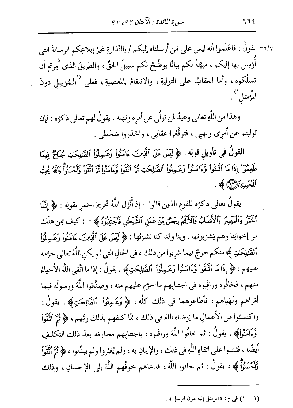 §الْقَوْلُ فِي تَأْوِيلِ قَوْلِهِ تَعَالَى: {لَيْسَ عَلَى الَّذِينَ آمَنُوا وَعَمِلُوا الصَّالِحَاتِ جُنَاحٌ فِيمَا طَعِمُوا إِذَا مَا اتَّقَوْا وَآمَنُوا وَعَمِلُوا الصَّالِحَاتِ ثُمَّ اتَّقَوْا وَآمَنُوا ثُمَّ اتَّقَوْا وَأَحْسَنُوا وَاللَّهُ يُحِبُّ الْمُحْسِنِينَ} [المائدة: 93] يَقُولُ تَعَالَى ذِكْرُهُ لِلْقَوْمِ الَّذِينَ قَالُوا إِذْ أَنْزَلَ اللَّهُ تَحْرِيمَ الْخَمْرِ بِقَوْلِهِ: {إِنَّمَا الْخَمْرُ وَالْمَيْسِرُ وَالْأَنْصَابُ وَالْأَزْلَامُ رِجْسٌ مِنْ عَمَلِ الشَّيْطَانِ فَاجْتَنِبُوهُ} [المائدة: 90] : كَيْفَ بِمَنْ هَلَكَ مِنْ إِخْوَانِنَا وَهُمْ يَشْرَبُونَهَا وَبِنَا وَقَدْ كُنَّا نَشْرَبُهَا: {لَيْسَ عَلَى الَّذِينَ آمَنُوا وَعَمِلُوا الصَّالِحَاتِ} [المائدة: 93] مِنْكُمْ حَرَجٌ فِيمَا شَرِبُوا مِنْ ذَلِكَ فِي الْحَالِ الَّتِي لَمْ يَكُنِ اللَّهُ تَعَالَى حَرَّمَهُ عَلَيْهِمْ، {إِذَا مَا اتَّقَوْا وَآمَنُوا وَعَمِلُوا الصَّالِحَاتِ} [المائدة: 93] ، يَقُولُ: إِذَا مَا اتَّقَى اللَّهَ الْأَحْيَاءُ مِنْهُمْ، فَخَافُوهُ وَرَاقَبُوهُ فِي اجْتِنَابِهِمْ مَا حُرِّمَ عَلَيْهِمْ مِنْهُ، وَصَدَّقُوا اللَّهَ وَرَسُولَهُ فِيمَا أَمَرَاهُمْ وَنَهَاهُمْ، فَأَطَاعُوهُمَا فِي ذَلِكَ كُلِّهِ {وَعَمِلُوا الصَّالِحَاتِ} [البقرة: 25] يَقُولُ: وَاكْتَسَبُوا مِنَ الْأَعْمَالِ مَا يَرْضَاهُ اللَّهُ فِي ذَلِكَ مِمَّا كَلَّفَهُمْ بِذَلِكَ رَبُّهُمْ {ثُمَّ اتَّقَوْا وَآمَنُوا} [المائدة: 93] يَقُولُ: ثُمَّ خَافُوا اللَّهَ وَرَاقَبُوهُ بِاجْتِنَابِهِمْ مَحَارِمَهُ بَعْدَ ذَلِكَ التَّكْلِيفِ أَيْضًا، فَثَبَتُوا عَلَى اتِّقَاءِ اللَّهِ فِي ذَلِكَ وَالْإِيمَانِ بِهِ، وَلَمْ يُغَيِّرُوا وَلَمْ يُبَدِّلُوا {ثُمَّ اتَّقَوْا وَأَحْسَنُوا} [المائدة: 93] يَقُولُ: ثُمَّ خَافُوا اللَّهَ، فَدَعَاهُمْ خَوْفُهُمُ اللَّهَ إِلَى الْإِحْسَانِ، وَذَلِكَ