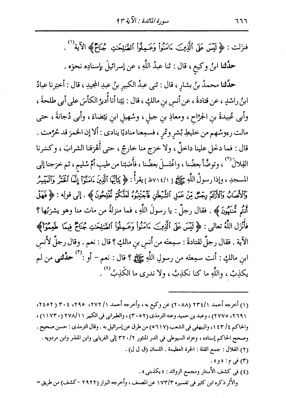 حَدَّثَنَا مُحَمَّدُ بْنُ بَشَّارٍ، قَالَ: ثني عَبْدُ الْكَبِيرِ بْنُ عَبْدِ الْمَجِيدِ، قَالَ: أَخْبَرَنَا عَبَّادُ بْنُ رَاشِدٍ، عَنْ قَتَادَةَ، عَنْ أَنَسِ بْنِ مَالِكٍ، قَالَ: " بَيْنَا أَنَا أُدِيرُ الْكَأْسَ، عَلَى أَبِي طَلْحَةَ وَأَبِي عُبَيْدَةَ بْنِ الْجَرَّاحِ وَمُعَاذِ بْنِ جَبَلٍ وَسُهَيْلِ بْنِ بَيْضَاءَ وَأَبِي دُجَانَةَ، حَتَّى مَالَتْ رُءُوسُهُمْ مِنْ خَلِيطِ بُسْرٍ وَتَمْرٍ، فَسَمِعْنَا مُنَادِيًا يُنَادِي: أَلَا إِنَّ الْخَمْرَ قَدْ حُرِّمَتْ، قَالَ: فَمَا دَخَلَ عَلَيْنَا دَاخِلٌ وَلَا خَرَجَ مِنَّا خَارِجٌ حَتَّى أَهْرَقْنَا الشَّرَابَ وَكَسَرْنَا الْقِلَالَ. وَتَوَضَّأَ بَعْضُنَا، وَاغْتَسَلَ بَعْضُنَا، فَأَصَبْنَا مِنْ طِيبِ أُمِّ سُلَيْمٍ، ثُمَّ خَرَجْنَا إِلَى الْمَسْجِدِ، وَإِذَا رَسُولُ اللَّهِ صَلَّى اللهُ عَلَيْهِ وَسَلَّمَ §يَقْرَأُ: {يَا أَيُّهَا الَّذِينَ آمَنُوا إِنَّمَا الْخَمْرُ وَالْمَيْسِرُ وَالْأَنْصَابُ وَالْأَزْلَامُ رِجْسٌ مِنْ عَمَلِ الشَّيْطَانِ فَاجْتَنِبُوهُ لَعَلَّكُمْ تُفْلِحُونَ} [المائدة: 90] إِلَى قَوْلِهِ: {فَهَلْ أَنْتُمْ مُنْتَهُونَ} [المائدة: 91] ، فَقَالَ رَجُلٌ: يَا رَسُولَ اللَّهِ، فَمَا مَنْزِلَةُ مَنْ مَاتَ مِنَّا وَهُوَ يَشْرَبُهَا؟ فَأَنْزَلَ اللَّهُ تَعَالَى: {لَيْسَ عَلَى الَّذِينَ آمَنُوا وَعَمِلُوا الصَّالِحَاتِ جُنَاحٌ فِيمَا طَعِمُوا} [المائدة: 93] الْآيَةَ " فَقَالَ رَجُلٌ لِقَتَادَةَ: سَمِعْتَهُ مِنْ أَنَسِ بْنِ مَالِكٍ؟ قَالَ: نَعَمْ، وَقَالَ رَجُلٌ لِأَنَسِ بْنِ مَالِكٍ: أَنْتَ سَمِعْتَهُ مِنْ رَسُولِ اللَّهِ صَلَّى اللهُ عَلَيْهِ وَسَلَّمَ؟ قَالَ: نَعَمْ، وَحَدَّثَنِي مَنْ لَمْ يَكْذِبْ، وَاللَّهِ مَا كُنَّا نَكْذِبُ وَلَا نَدْرِي مَا الْكَذِبُ "
