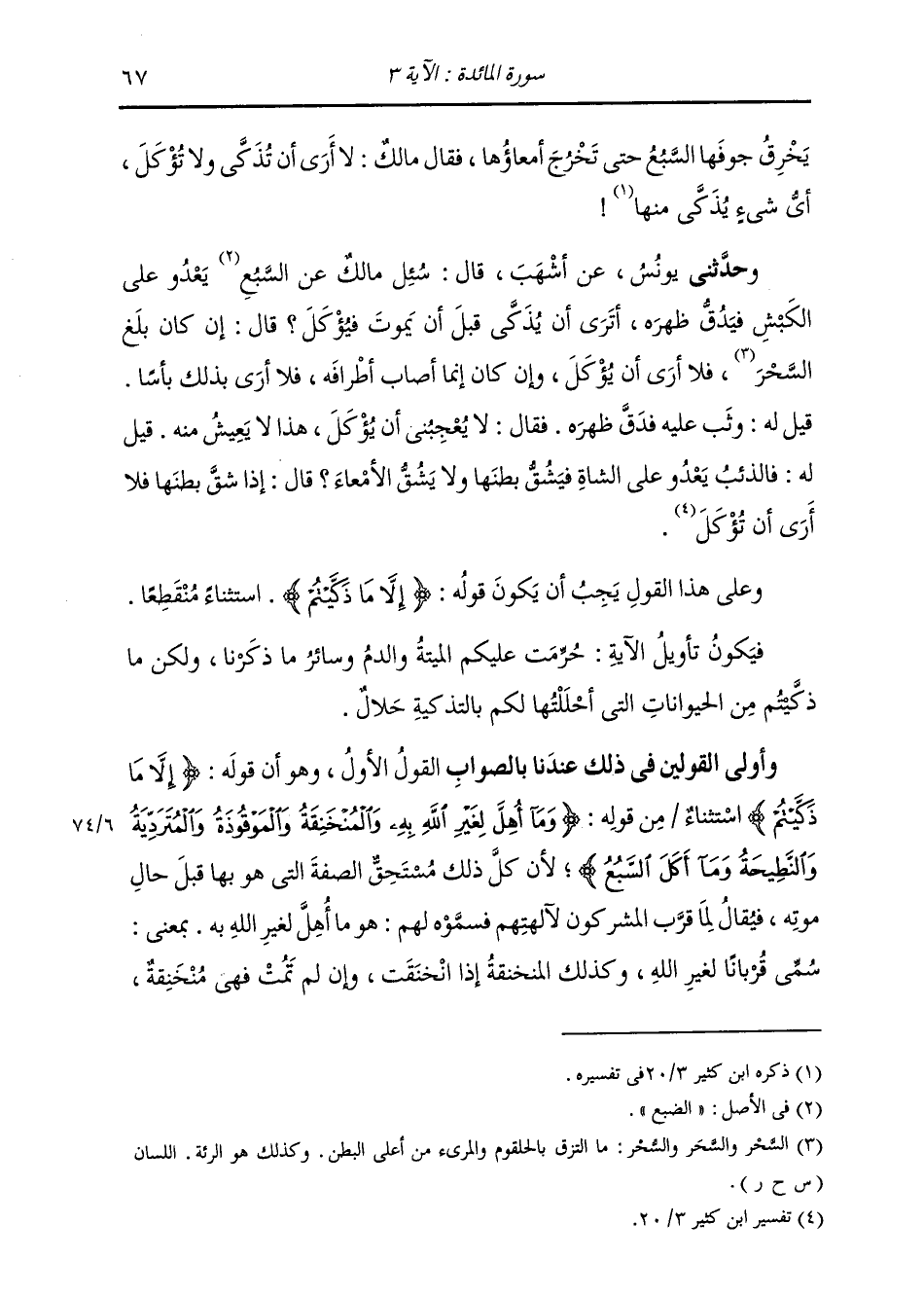 حَدَّثَنِي يُونُسُ , عَنْ أَشْهَبَ , قَالَ: سُئِلَ مَالِكٌ , عَنِ §السَّبُعُ , يَعْدُو عَلَى الْكَبْشِ , فَيَدُقُّ ظَهْرَهُ , أَتَرَى أَنْ يُذَكَّى قَبْلَ أَنْ يَمُوتَ فَيُؤْكَلَ؟ قَالَ: " إِنْ كَانَ بَلَغَ السَّحْرَ , فَلَا أَرَى أَنْ يُؤْكَلَ , وَإِنْ كَانَ إِنَّمَا أَصَابَ أَطْرَافَهُ , فَلَا أَرَى بِذَلِكَ بَأْسًا. قِيلَ لَهُ: وَثَبَ عَلَيْهِ فَدَقَّ ظَهْرَهُ؟ قَالَ: لَا يُعْجِبُنِي أَنْ يُؤْكَلَ , هَذَا لَا يَعِيشُ مِنْهُ. قِيلَ لَهُ: فَالذِّئْبُ يَعْدُو عَلَى الشَّاةِ فَيَشُقُّ بَطْنَهَا وَلَا يَشُقُّ الْأَمْعَاءَ؟ قَالَ: إِذَا شَقَّ بَطْنَهَا فَلَا أَرَى أَنْ تُؤْكَلَ " وَعَلَى هَذَا الْقَوْلِ يَجِبُ أَنْ يَكُونَ قَوْلُهُ: {إِلَّا مَا ذَكَّيْتُمْ} [المائدة: 3] اسْتِثْنَاءً مُنْقَطِعًا , فَيَكُونَ تَأْوِيلُ الْآيَةِ: حُرِّمَتْ عَلَيْكُمُ الْمَيْتَةُ وَالدَّمُ , وَسَائِرُ مَا ذَكَرْنَا , وَلَكِنْ مَا ذَكَّيْتُمْ مِنَ الْحَيَوَانَاتِ الَّتِي أَحْلَلْتُهَا لَكُمْ بِالتَّذْكِيَةِ حَلَالٌ. وَأَوْلَى الْقَوْلَيْنِ فِي ذَلِكَ عِنْدَنَا بِالصَّوَابِ الْقَوْلُ الْأَوَّلُ , وَهُوَ أَنَّ قَوْلَهُ: {إِلَّا مَا ذَكَّيْتُمْ} [المائدة: 3] اسْتِثْنَاءٌ مِنْ قَوْلِهِ: {وَمَا أُهِلَّ لِغَيْرِ اللَّهِ بِهِ وَالْمُنْخَنِقَةُ وَالْمَوْقُوذَةُ وَالْمُتَرَدِّيَةُ وَالنَّطِيحَةُ وَمَا أَكَلَ السَّبُعُ} [المائدة: 3] لِأَنَّ كُلَّ ذَلِكَ مُسْتَحِقٌّ الصِّفَةَ الَّتِي هُوَ بِهَا قَبْلَ حَالِ مَوْتِهِ , فَيُقَالَ: لِمَا قَرَّبَ الْمُشْرِكُونَ لِآلِهَتِهِمْ فَسَمَّوْهُ لَهُمْ: هُوَ {مَا أُهِلَّ لِغَيْرِ اللَّهِ بِهِ} [المائدة: 3] بِمَعْنَى: سُمِّيَ قُرْبَانًا لِغَيْرِ اللَّهِ. وَكَذَلِكَ الْمُنْخَنِقَةُ: إِذَا انْخَنَقَتْ , وَإِنْ لَمْ تَمُتْ فَهِيَ مُنْخَنِقَةٌ ,