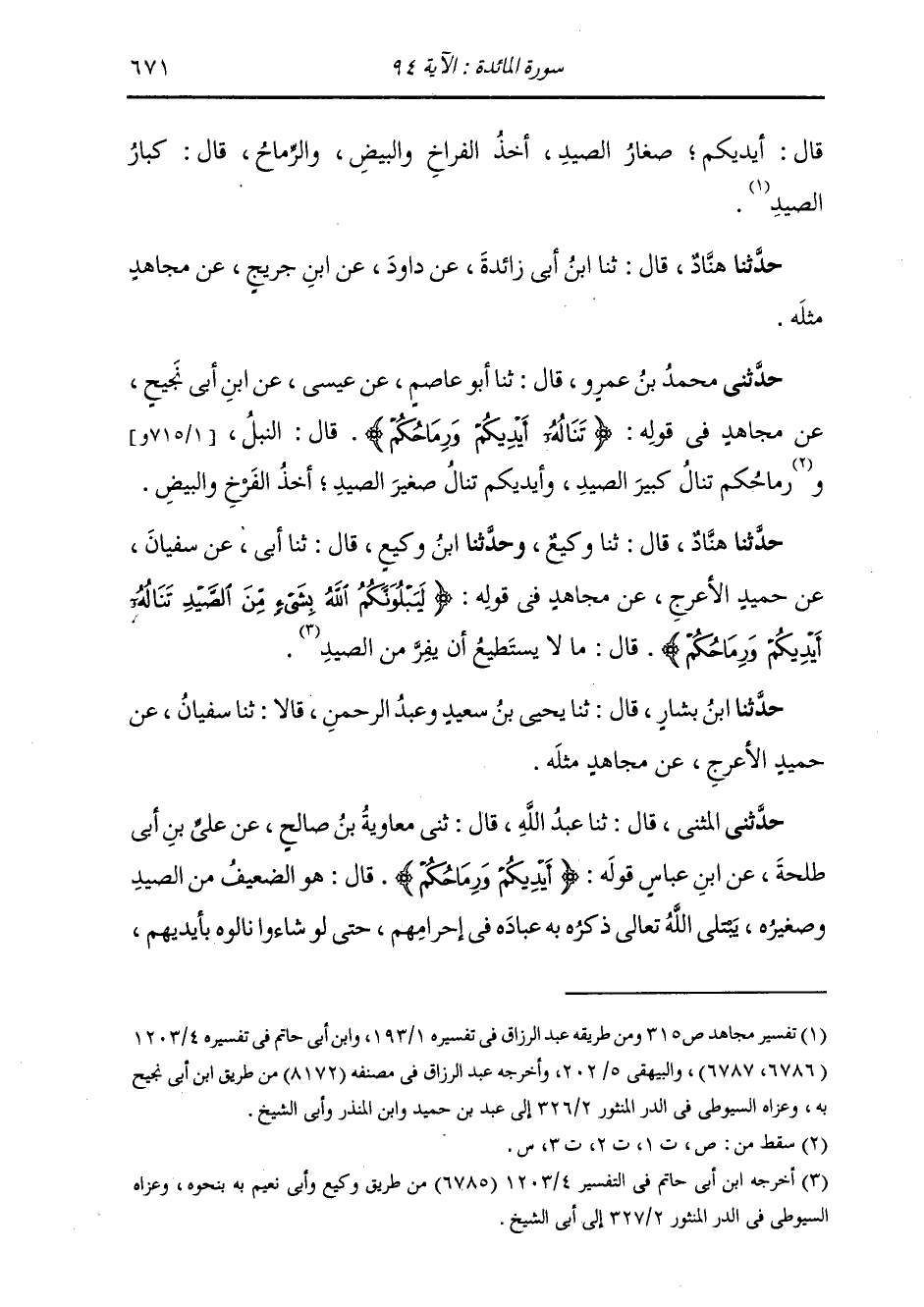 حَدَّثَنَا هَنَّادٌ، قَالَ: ثنا وَكِيعٌ، وَحَدَّثَنَا ابْنُ وَكِيعٍ، قَالَ: ثنا أَبِي، عَنْ سُفْيَانَ، عَنْ حُمَيْدٍ الْأَعْرَجِ، عَنْ مُجَاهِدٍ، فِي قَوْلِهِ: {لَيَبْلُوَنَّكُمُ اللَّهُ بِشَيْءٍ مِنَ الصَّيْدِ تَنَالُهُ أَيْدِيكُمْ وَرِمَاحُكُمْ} [المائدة: 94] قَالَ: «§مَا لَا يَسْتَطِيعُ أَنْ يَفِرَّ مِنَ الصَّيْدِ» حَدَّثَنَا ابْنُ بَشَّارٍ قَالَ: ثنا يَحْيَى بْنُ سَعِيدٍ وَعَبْدُ الرَّحْمَنِ، قَالَا: ثنا سُفْيَانُ، عَنْ حُمَيْدٍ الْأَعْرَجِ، عَنْ مُجَاهِدٍ، مِثْلَهُ