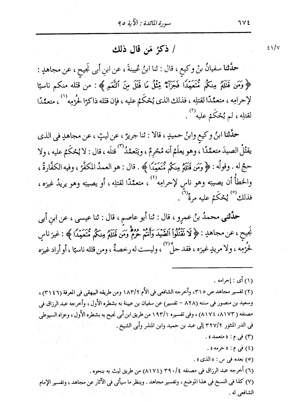 ذِكْرُ مَنْ قَالَ ذَلِكَ حَدَّثَنَا سُفْيَانُ بْنُ وَكِيعٍ، قَالَ: ثنا ابْنُ عُيَيْنَةَ، عَنِ ابْنِ أَبِي نَجِيحٍ، عَنْ مُجَاهِدٍ، {وَمَنْ قَتَلَهُ مِنْكُمْ مُتَعَمِّدًا فَجَزَاءٌ مِثْلُ مَا قَتَلَ مِنَ النَّعَمِ} [المائدة: 95] : «§مَنْ قَتَلَهُ مِنْكُمْ نَاسِيًا لِإِحْرَامِهِ مُتَعَمِّدًا لِقَتْلِهِ، فَذَلِكَ الَّذِي يُحْكَمُ عَلَيْهِ. فَإِنْ قَتَلَهُ ذَاكِرًا لِحُرْمِهِ مُتَعَمِّدًا لِقَتْلِهِ، لَمْ يُحْكَمْ عَلَيْهِ»