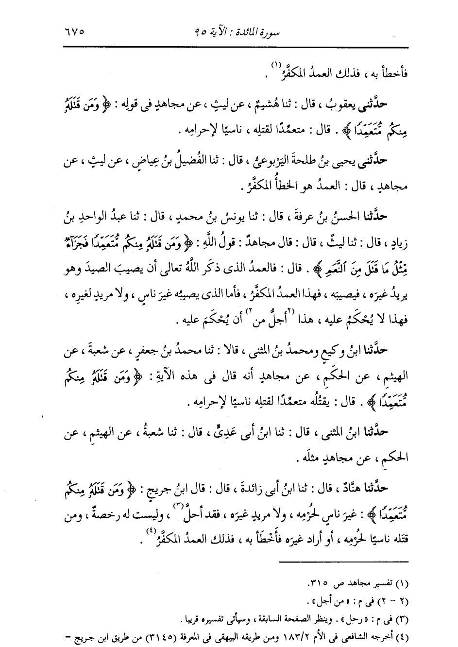 حَدَّثَنَا ابْنُ وَكِيعٍ، وَمُحَمَّدُ بْنُ الْمُثَنَّى، قَالَا: ثنا مُحَمَّدُ بْنُ جَعْفَرٍ، عَنْ شُعْبَةَ، عَنِ الْهَيْثَمِ، عَنِ الْحَكَمِ، عَنْ مُجَاهِدٍ، أَنَّهُ قَالَ فِي هَذِهِ الْآيَةِ: {وَمَنْ قَتَلَهُ مِنْكُمْ مُتَعَمِّدًا} [المائدة: 95] قَالَ: «§يَقْتُلُهُ مُتَعَمِّدًا لِقَتْلِهِ، نَاسِيًا لِإِحْرَامِهِ» حَدَّثَنَا ابْنُ الْمُثَنَّى قَالَ: ثنا ابْنُ أَبِي عَدِيٍّ قَالَ: ثنا شُعْبَةُ، عَنِ الْهَيْثَمِ، عَنِ الْحَكَمِ، عَنْ مُجَاهِدٍ، مِثْلَهُ