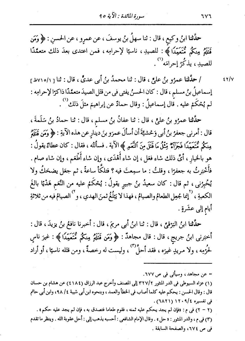 حَدَّثَنَا عَمْرُو بْنُ عَلِيٍّ، قَالَ: ثنا عَفَّانُ بْنُ مُسْلِمٍ، قَالَ: ثنا حَمَّادُ بْنُ سَلَمَةَ، قَالَ: أَمَرَنِي جَعْفَرُ بْنُ أَبِي وَحْشِيَّةَ أَنْ أَسْأَلَ، عَمْرَو بْنَ دِينَارٍ عَنْ هَذِهِ الْآيَةِ: {وَمَنْ قَتَلَهُ مِنْكُمْ مُتَعَمِّدًا فَجَزَاءٌ مِثْلُ مَا قَتَلَ مِنَ النَّعَمِ} [المائدة: 95] الْآيَةَ، فَسَأَلْتُهُ، فَقَالَ: كَانَ عَطَاءٌ يَقُولُ: «§هُوَ بِالْخِيَارِ أَيَّ ذَلِكَ شَاءَ فَعَلَ، إِنْ شَاءَ أَهْدَى، وَإِنْ شَاءَ أَطْعَمَ، وَإِنْ شَاءَ صَامَ» فَأَخْبَرْتُ بِهِ جَعْفَرًا وَقُلْتُ: مَا سَمِعْتَ فِيهِ؟ فَتَلَكَّأَ سَاعَةً ثُمَّ جَعَلَ يَضْحَكُ وَلَا يُخْبِرُنِي، ثُمَّ قَالَ: كَانَ سَعِيدُ بْنُ جُبَيْرٍ يَقُولُ: «يُحْكَمُ عَلَيْهِ مِنَ النَّعَمِ هَدْيًا بَالِغَ الْكَعْبَةِ، فَإِنْ لَمْ يَجِدْ يُحْكَمْ عَلَيْهِ ثَمَنُهُ، فَقَوَّمَ طَعَامًا فَتَصَدَّقَ بِهِ، فَإِنْ لَمْ يَجِدْ عَلَيْهِ حَكَمَ الصِّيَامَ فِيهِ مِنْ ثَلَاثَةِ أَيَّامٍ إِلَى عَشَرَةٍ»