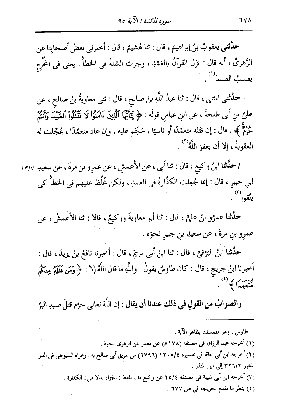 حَدَّثَنِي الْمُثَنَّى، قَالَ: ثنا عَبْدُ اللَّهِ بْنُ صَالِحٍ، قَالَ: ثَنِي مُعَاوِيَةُ بْنُ صَالِحٍ، عَنْ عَلِيِّ بْنِ أَبِي طَلْحَةَ، عَنِ ابْنِ عَبَّاسٍ، قَوْلُهُ: {يَا أَيُّهَا الَّذِينَ آمَنُوا لَا تَقْتُلُوا الصَّيْدَ وَأَنْتُمْ حُرُمٌ} [المائدة: 95] ، قَالَ: «§إِنْ قَتَلَهُ مُتَعَمِّدًا أَوْ نَاسِيًا حُكِمَ عَلَيْهِ، وَإِنْ عَادَ مُتَعَمِّدًا عُجِّلَتْ لَهُ الْعُقُوبَةُ، إِلَّا أَنْ يَعْفُوَ اللَّهُ»