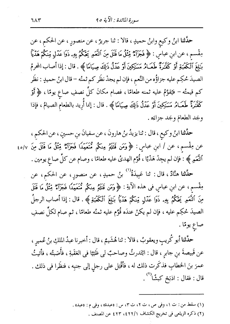 حَدَّثَنَا ابْنُ وَكِيعٍ وَابْنُ حُمَيْدٍ، قَالَا: ثنا جَرِيرٌ، عَنْ مَنْصُورٍ، عَنِ الْحَكَمِ، عَنْ مِقْسَمٍ، عَنِ ابْنِ عَبَّاسٍ: {فَجَزَاءٌ مِثْلُ مَا قَتَلَ مِنَ النَّعَمِ يَحْكُمُ بِهِ ذَوَا عَدْلٍ مِنْكُمْ هَدْيًا بَالِغَ الْكَعْبَةِ أَوْ كَفَّارَةٌ طَعَامُ مَسَاكِينَ أَوْ عَدْلُ ذَلِكَ صِيَامًا} [المائدة: 95] ، قَالَ: «§إِذَا أَصَابَ الْمُحْرِمُ الصَّيْدَ حُكِمَ عَلَيْهِ جَزَاؤُهُ مِنَ النَّعَمِ، فَإِنْ لَمْ يَجِدْ نَظَرَ كَمْ ثَمَنُهُ» قَالَ ابْنُ حُمَيْدٍ: " نَظَرَ كَمْ قِيمَتُهُ فَقُوِّمَ عَلَيْهِ ثَمَنُهُ طَعَامًا، فَصَامَ مَكَانَ كُلِّ نِصْفِ صَاعٍ يَوْمًا، أَوْ كَفَّارَةٌ طَعَامُ مَسَاكِينَ، أَوْ عَدْلُ ذَلِكَ صِيَامًا. قَالَ: إِنَّمَا أُرِيدَ بِالطَّعَامِ الصِّيَامَ، فَإِذَا وَجَدَ الطَّعَامَ وَجَدَ جَزَاءَهُ "