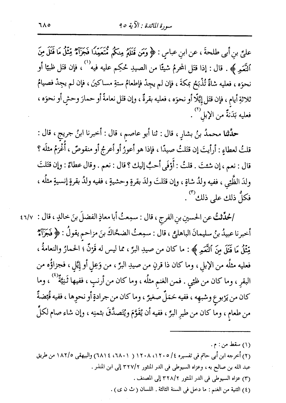 حُدِّثْتُ عَنِ الْحُسَيْنِ بْنِ الْفَرَجِ، قَالَ: سَمِعْتُ أَبَا مُعَاذٍ الْفَضْلَ بْنَ خَالِدٍ، قَالَ: أَخْبَرَنَا عُبَيْدُ بْنُ سُلَيْمَانَ الْبَاهِلِيُّ، قَالَ: سَمِعْتُ الضَّحَّاكَ بْنَ مُزَاحِمٍ، يَقُولُ: {فَجَزَاءٌ مِثْلُ مَا قَتَلَ مِنَ النَّعَمِ} [المائدة: 95] «§مَا كَانَ مِنْ صَيْدِ الْبَرِّ مِمَّا لَيْسَ لَهُ قَرْنُ الْحِمَارِ وَالنَّعَامَةِ فَعَلَيْهِ مِثْلُهُ مِنَ الْإِبِلِ، وَمَا كَانَ ذَا قَرْنٍ مِنْ صَيْدِ الْبَرِّ مِنْ وَعْلٍ أَوْ أَيِّلٍ فَجَزَاؤُهُ مِنَ الْبَقَرِ، وَمَا كَانَ مِنْ ظَبْي فَمِنَ الْغَنَمِ مِثْلُهُ، وَمَا كَانَ مِنْ أَرْنَبٍ فَفِيهَا ثَنِيَّةٌ، وَمَا كَانَ مِنْ يَرْبُوعٍ وَشِبْهِهِ فَفِيهِ حَمَلٌ صَغِيرٌ، وَمَا كَانَ مِنْ جَرَادَةٍ أَوْ نَحْوِهَا فَفِيهِ قَبْضَةٌ مِنْ طَعَامٍ، وَمَا كَانَ مِنْ طَيْرِ الْبَرِّ فَفِيهِ أَنْ يَقُومَ وَيَتَصَدَّقَ بِثَمَنِهِ، وَإِنْ شَاءَ صَامَ لِكُلِّ