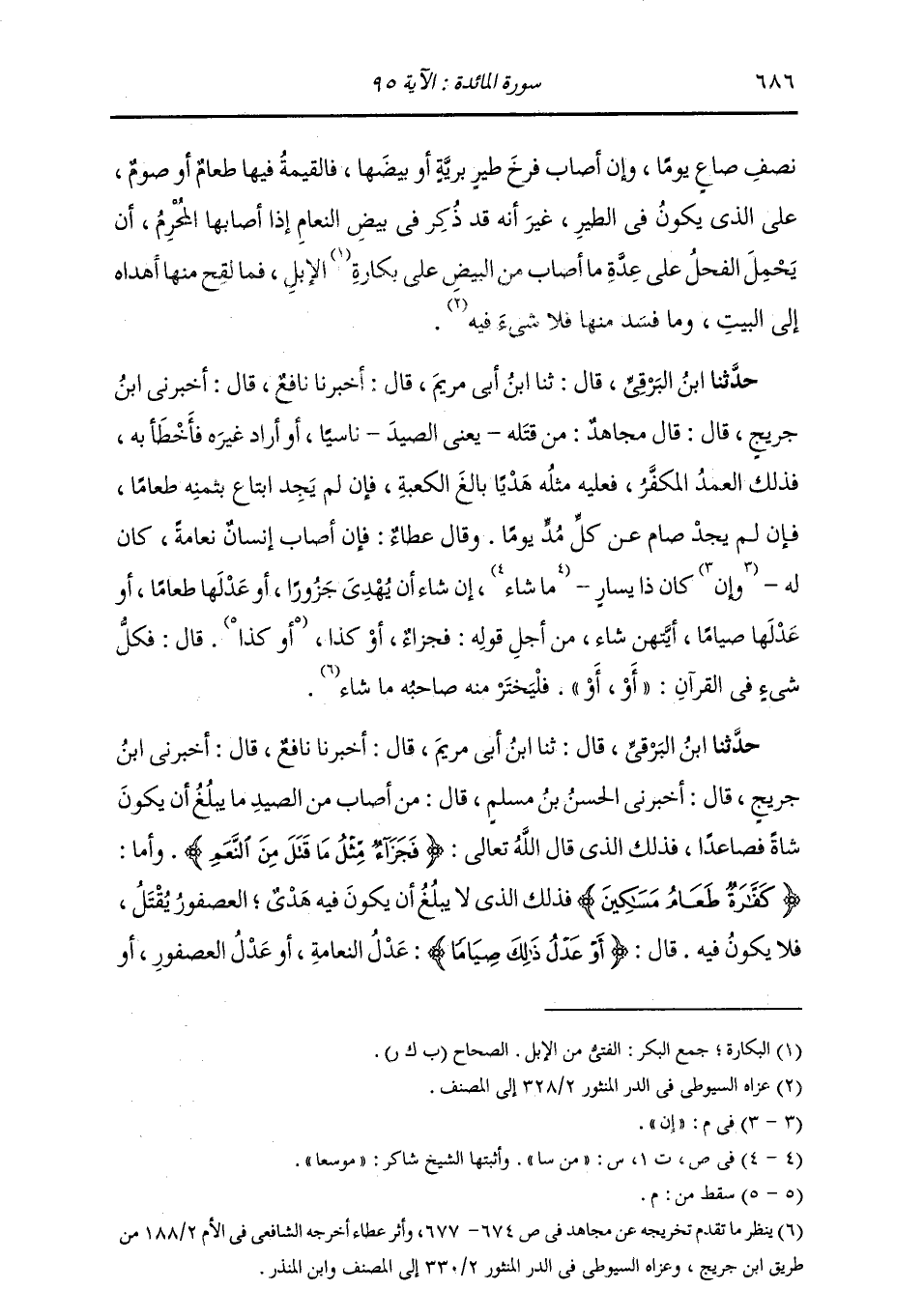 حَدَّثَنَا ابْنُ الْبَرْقِيِّ، قَالَ: ثنا ابْنُ أَبِي مَرْيَمَ، قَالَ: أَخْبَرَنَا نَافِعٌ، قَالَ: أَخْبَرَنِي ابْنُ جُرَيْجٍ، قَالَ: أَخْبَرَنِي الْحَسَنُ بْنُ مُسْلِمٍ، قَالَ: " §مَنْ أَصَابَ مِنَ الصَّيْدِ مَا يَبْلُغُ أَنْ يَكُونَ شَاةً فَصَاعِدًا، فَذَلِكَ الَّذِي قَالَ اللَّهُ تَعَالَى: {فَجَزَاءٌ مِثْلُ مَا قَتَلَ مِنَ النَّعَمِ} [المائدة: 95] ، وَأَمَّا {كَفَّارَةٌ طَعَامُ مَسَاكِينَ} [المائدة: 95] فَذَلِكَ الَّذِي لَا يَبْلُغُ أَنْ يَكُونَ فِيهِ هَدْي، الْعُصْفُورُ يُقْتَلُ فَلَا يَكُونُ فِيهِ. قَالَ: أَوْ عَدْلُ ذَلِكَ صِيَامًا، عَدْلُ النَّعَامَةِ، أَوْ عَدْلُ الْعُصْفُورِ، أَوْ -[687]- عَدْلُ ذَلِكَ كُلِّهِ " وَقَالَ آخَرُونَ: بَلْ يُقَوَّمُ الصَّيْدُ الْمَقْتُولُ قِيمَتَهُ مِنَ الدَّرَاهِمِ، ثُمَّ يَشْتَرِي الْقَاتِلُ بِقِيمَتِهِ نِدًّا مِنَ النَّعَمِ، ثُمَّ يَهْدِيهِ إِلَى الْكَعْبَةِ