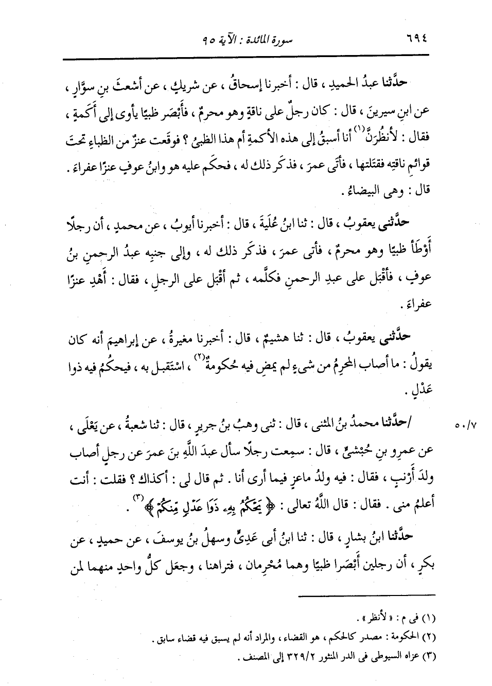 حَدَّثَنِي يَعْقُوبُ، قَالَ: ثنا ابْنُ عُلَيَّةَ، قَالَ: أَخْبَرَنَا أَيُّوبُ، عَنْ مُحَمَّدٍ، أَنَّ رَجُلًا، أَوْطَأَ ظَبْيًا وَهُوَ مُحْرِمٌ، فَأَتَى عُمَرَ فَذَكَرَ ذَلِكَ لَهُ وَإِلَى جَنْبِهِ عَبْدُ الرَّحْمَنِ بْنُ عَوْفٍ، فَأَقْبَلَ عَلَى عَبْدِ الرَّحْمَنِ فَكَلَّمَهُ، ثُمَّ أَقْبَلَ عَلَى الرَّجُلِ فَقَالَ: «§أَهْدِ عَنْزًا عَفْرَاءَ»