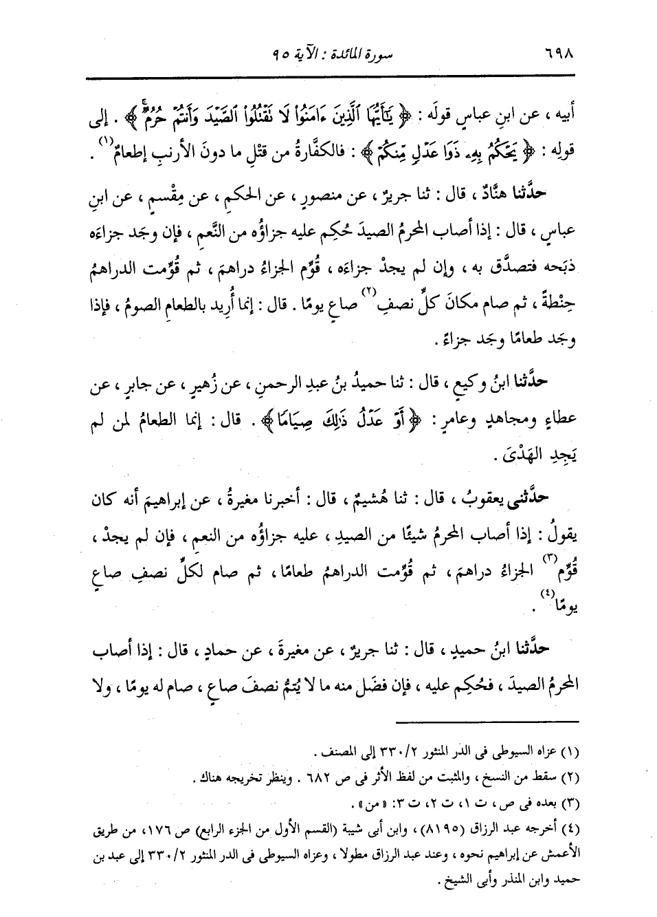 حَدَّثَنَا ابْنُ حُمَيْدٍ، قَالَ: ثنا جَرِيرٌ، عَنْ مُغِيرَةَ، عَنْ حَمَّادٍ، قَالَ: " §إِذَا أَصَابَ الْمُحْرِمُ الصَّيْدَ فَحُكِمَ عَلَيْهِ، فَإِنْ فَضَلَ مِنْهُ مَا لَا يُتِمُّ نِصْفَ صَاعٍ صَامَ لَهُ يَوْمًا، وَلَا -[699]- يَكُونُ الصَّوْمُ إِلَّا عَلَى مَنْ لَمْ يَجِدْ ثَمَنَ هَدْي فَيُحْكَمُ عَلَيْهِ الطَّعَامُ. فَإِنْ لَمْ يَكُنْ عِنْدَهُ طَعَامٌ يَتَصَدَّقُ بِهِ، حُكِمَ عَلَيْهِ الصَّوْمُ، فَصَامَ مَكَانَ كُلِّ نِصْفِ صَاعٍ يَوْمًا. {كَفَّارَةٌ طَعَامُ مَسَاكِينَ} [المائدة: 95] قَالَ: فِيمَا لَا يَبْلُغُ ثَمَنَ هَدْي. {أَوْ عَدْلُ ذَلِكَ صِيَامًا} [المائدة: 95] مِنَ الْجَزَاءِ إِذَا لَمْ يَجِدْ مَا يَشْتَرِي بِهِ هَدْيًا، أَوْ مَا يَتَصَدَّقُ بِهِ، مِمَّا لَا يَبْلُغُ ثَمَنَ هَدْي، حُكِمَ عَلَيْهِ الصِّيَامُ مَكَانَ كُلِّ نِصْفِ صَاعٍ يَوْمًا "