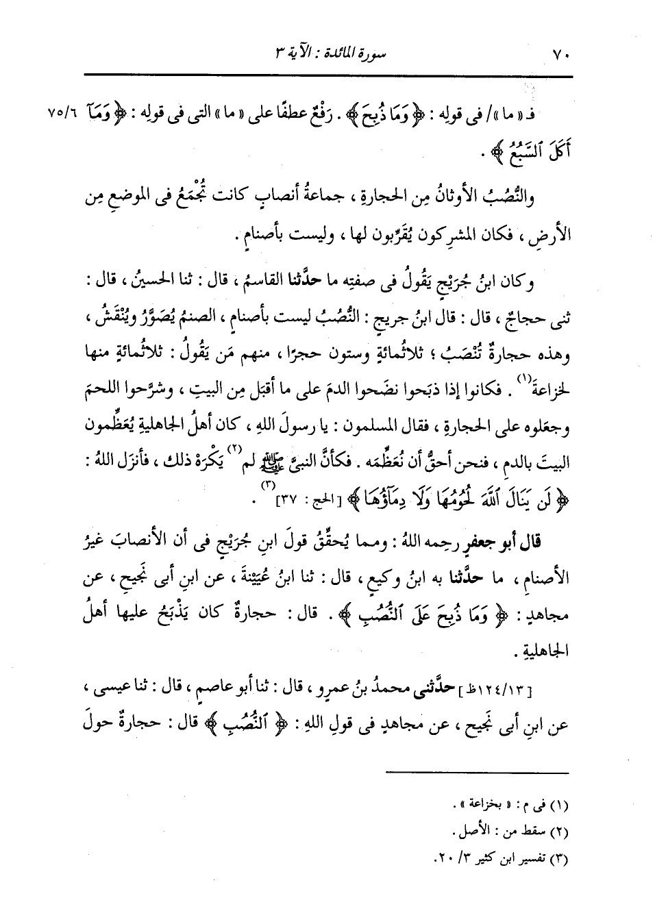 حَدَّثَنَا الْقَاسِمُ: قَالَ: ثنا الْحُسَيْنُ , قَالَ: ثني حَجَّاجٌ , قَالَ: قَالَ ابْنُ جُرَيْجٍ: §النُّصُبُ: لَيْسَتْ بِأَصْنَامٍ , الصَّنَمُ يُصَوَّرُ وَيُنْقَشُ , وَهَذِهِ حِجَارَةٌ تُنْصَبُ ثَلَاثُمِائَةٍ وَسِتُّونَ حَجَرًا , مِنْهُمْ مَنْ يَقُولُ: ثَلَاثُمِائَةٍ مِنْهَا لِخُزَاعَةَ. فَكَانُوا إِذَا ذَبَحُوا , نَضَحُوا الدَّمَ عَلَى مَا أَقْبَلَ مِنَ الْبَيْتِ , وَشَرَحُوا اللَّحْمَ وَجَعَلُوهُ عَلَى الْحِجَارَةِ , فَقَالَ الْمُسْلِمُونَ: يَا رَسُولَ اللَّهِ , كَانَ أَهْلُ الْجَاهِلِيَّةِ يُعَظِّمُونَ الْبَيْتَ بِالدَّمِ , فَنَحْنُ أَحَقُّ أَنْ نُعَظِّمَهُ. فَكَانَ النَّبِيُّ صَلَّى اللهُ عَلَيْهِ وَسَلَّمَ لَمْ يَكْرَهْ ذَلِكَ , فَأَنْزَلَ اللَّهُ: {لَنْ يَنَالَ اللَّهَ لُحُومُهَا وَلَا دِمَاؤُهَا} [الحج: 37] وَمِمَّا يُحَقِّقُ قَوْلَ ابْنِ جُرَيْجٍ فِي أَنَّ الْأَنْصَابَ غَيْرُ الْأَصْنَامِ مَا: