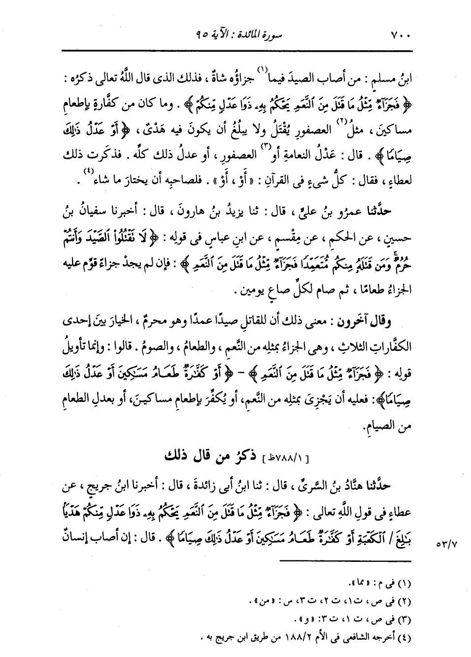 حَدَّثَنَا عَمْرُو بْنُ عَلِيٍّ، قَالَ: ثنا يَزِيدُ بْنُ هَارُونَ، قَالَ: أَخْبَرَنَا سُفْيَانُ بْنُ حُسَيْنٍ، عَنِ الْحَكَمِ، عَنْ مِقْسَمٍ، عَنِ ابْنِ عَبَّاسٍ، فِي قَوْلِهِ {لَا تَقْتُلُوا الصَّيْدَ وَأَنْتُمْ حُرُمٌ وَمَنْ قَتَلَهُ مِنْكُمْ مُتَعَمِّدًا فَجَزَاءٌ مِثْلُ مَا قَتَلَ مِنَ النَّعَمِ} [المائدة: 95] «§فَإِنْ لَمْ يَجِدْ جَزَاءً قُوِّمَ عَلَيْهِ الْجَزَاءُ طَعَامًا ثُمَّ صَامَ لِكُلِّ صَاعٍ يَوْمَيْنِ» وَقَالَ آخَرُونَ: مَعْنَى ذَلِكَ: أَنَّ لِلْقَاتِلِ صَيْدًا عَمْدًا وَهُوَ مُحْرِمٌ الْخِيَارَ بَيْنَ إِحْدَى الْكَفَّارَاتِ الثَّلَاثِ، وَهِيَ الْجَزَاءُ بِمِثْلِهِ مِنَ النَّعَمِ، وَالطَّعَامُ، وَالصَّوْمُ. قَالُوا: وَإِنَّمَا تَأْوِيلُ قَوْلِهِ: {فَجَزَاءٌ مِثْلُ مَا قَتَلَ مِنَ النَّعَمِ} [المائدة: 95] ، {أَوْ كَفَّارَةٌ طَعَامُ مَسَاكِينَ أَوْ عَدْلُ ذَلِكَ صِيَامًا} [المائدة: 95] فَعَلَيْهِ أَنْ يَجْزِيَ بِمِثْلِهِ مِنَ النَّعَمِ، أَوْ يُكَفِّرَ بِإِطْعَامِ مَسَاكِينَ أَوْ بِعَدْلِ الطَّعَامِ مِنَ الصِّيَامِ