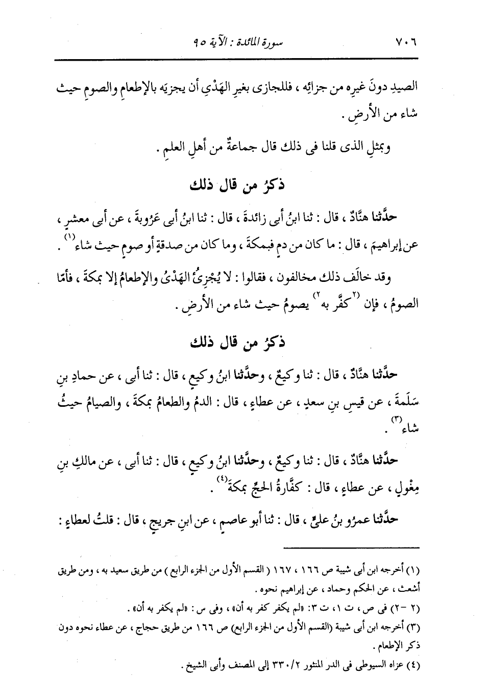 ذِكْرُ مَنْ قَالَ ذَلِكَ حَدَّثَنَا هَنَّادٌ، قَالَ: ثنا ابْنُ أَبِي زَائِدَةَ، قَالَ: ثنا ابْنُ أَبِي عَرُوبَةَ، عَنْ أَبِي مَعْشَرٍ، عَنْ إِبْرَاهِيمَ، قَالَ: «§مَا كَانَ مِنْ دَمٍ فَبِمَكَّةَ، وَمَا كَانَ مِنْ صَدَقَةٍ أَوْ صَوْمٍ حَيْثُ شَاءَ» وَقَدْ خَالَفَ ذَلِكَ مُخَالِفُونَ فَقَالُوا: لَا يُجْزِئُ الْهَدْي وَالْإِطْعَامُ إِلَّا بِمَكَّةَ، فَأَمَّا الصَّوْمُ فَإِنْ كَفَّرَ بِهِ يَصُومُ حَيْثُ شَاءَ مِنَ الْأَرْضِ