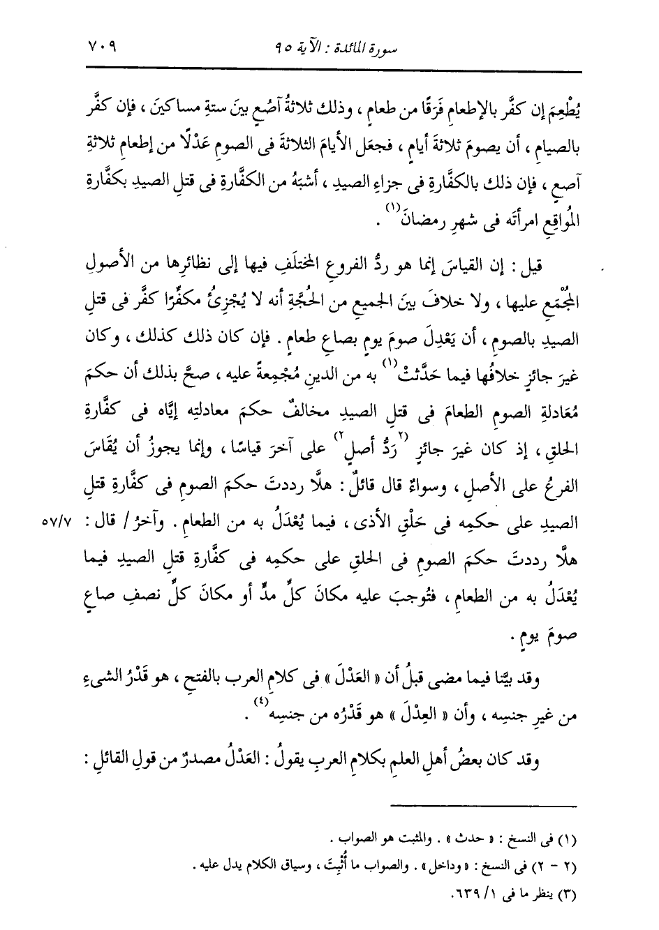 يُطْعِمَ إِنْ كَفَّرَ بِالْإِطْعَامِ فَرْقًا مِنْ طَعَامٍ وَذَلِكَ ثَلَاثَةَ آصُعٍ بَيْنَ سِتَّةِ مَسَاكِينَ، فَإِنْ كَفَّرَ بِالصِّيَامِ أَنْ يَصُومَ ثَلَاثَةَ أَيَّامٍ، فَجَعَلَ الْأَيَّامَ الثَّلَاثَةَ فِي الصَّوْمِ عَدْلًا مِنْ إِطْعَامِ ثَلَاثَةِ آصُعٍ، فَإِنَّ ذَلِكَ بِالْكَفَّارَةِ فِي جَزَاءِ الصَّيْدِ أَشْبَهُ مِنَ الْكَفَّارَةِ فِي قَتْلِ الصَّيْدِ بِكَفَّارَةِ الْمُوَاقِعِ امْرَأَتَهُ فِي شَهْرِ رَمَضَانَ؟ قِيلَ: إِنَّ الْقِيَاسَ إِنَّمَا هُوَ رَدُّ الْفُرُوعِ الْمُخْتَلَفِ فِيهَا إِلَى نَظَائِرِهَا مِنَ الْأُصُولِ الْمُجْمَعِ عَلَيْهَا، وَلَا خِلَافَ بَيْنَ الْجَمِيعِ مِنَ الْحُجَّةِ، أَنَّهُ لَا يُجْزِئُ مُكَفِّرًا كَفَّرَ فِي قَتْلِ الصَّيْدِ بِالصَّوْمِ، أَنْ يَعْدِلَ صَوْمَ يَوْمٍ بِصَاعِ طَعَامٍ. فَإِنْ كَانَ ذَلِكَ كَذَلِكَ، وَكَانَ غَيْرُ جَائِزٍ خِلَافُهَا فِيمَا حُدِّثَ بِهِ مِنَ الدِّينِ مُجْمَعَةً عَلَيْهِ صَحَّ بِذَلِكَ أَنَّ حُكْمَ مُعَادَلَةِ الصَّوْمِ الطَّعَامَ فِي قَتْلَ الصَّيْدِ مُخَالِفٌ حُكْمَ مُعَادَلَتِهِ إِيَّاهُ فِي كَفَّارَةِ الْحَلْقِ، إِذَا كَانَ غَيْرَ جَائِزٍ، وَدَاخِلٌ عَلَى آخَرِ قِيَاسًا، وَإِنَّمَا يَجُوزُ أَنْ يُقَاسَ الْفَرْعُ عَلَى الْأَصْلِ، وَسَوَاءٌ قَالَ قَائِلٌ: هَلَّا رَدَدْتَ حُكْمَ الصَّوْمِ فِي كَفَّارَةِ قَتْلِ الصَّيْدِ عَلَى حُكْمِهِ فِي حَلْقِ الْأَذَى فِيمَا يَعْدِلُ بِهِ مِنَ الطَّعَامِ، وَآخَرُ قَالَ: هَلَّا رَدَدْتَ حُكْمَ الصَّوْمِ فِي الْحَلْقِ عَلَى حُكْمِهِ فِي كَفَّارَةِ قَتْلِ الصَّيْدِ فِيمَا يَعْدِلُ بِهِ مِنَ الطَّعَامِ، فَتُوجِبُ عَلَيْهِ مَكَانَ كُلِّ مُدٍّ، أَوْ مَكَانَ كُلِّ نِصْفِ صَاعٍ، صَوْمَ يَوْمٍ. وَقَدْ بَيَّنَّا فِيمَا مَضَى قَبْلُ أَنَّ الْعَدْلَ فِي كَلَامِ الْعَرَبِ بِالْفَتْحِ، وَهُوَ قَدْرُ الشَّيْءِ مِنْ غَيْرِ جِنْسِهِ، وَأَنَّ الْعِدْلَ هُوَ قَدْرُهُ مِنْ جِنْسِهِ. وَقَدْ كَانَ بَعْضُ أَهْلِ الْعِلْمِ بِكَلَامِ الْعَرَبِ يَقُولُ: الْعَدْلُ مَصْدَرٌ مِنْ قَوْلِ الْقَائِلِ: