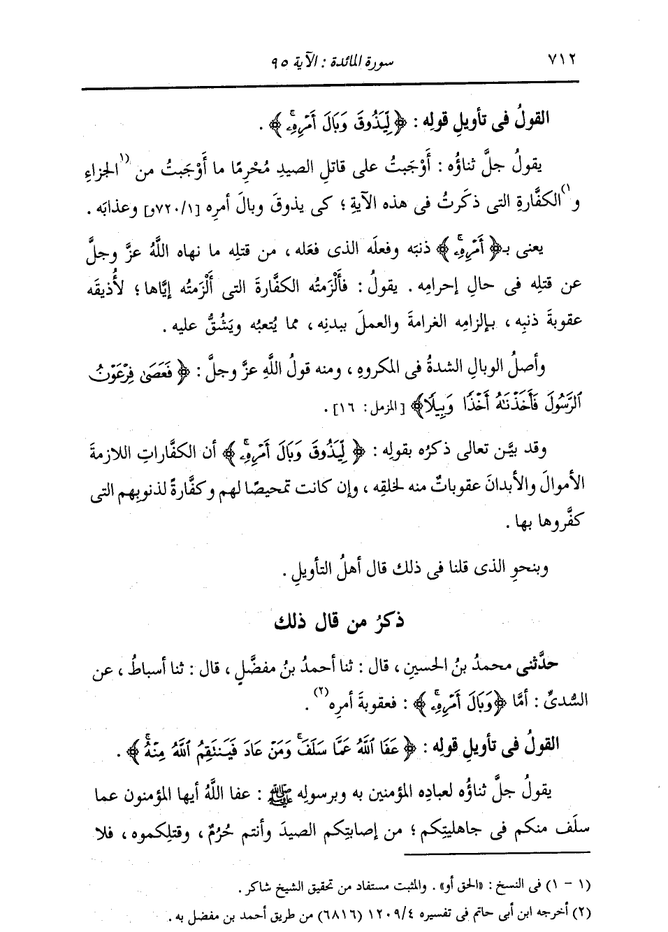 §الْقَوْلُ فِي تَأْوِيلِ قَوْلِهِ تَعَالَى: لِيَذُوقَ وَبَالَ أَمْرِهِ يَقُولُ جَلَّ ثَنَاؤُهُ: أَوْجَبْتُ عَلَى قَاتِلِ الصَّيْدِ مُحْرِمًا مَا أَوْجَبْتُ مِنَ الْحَقِّ أَوِ الْكَفَّارَةِ الَّذِي ذَكَرْتُ فِي هَذِهِ الْآيَةِ، كَيْ يَذُوقَ وَبَالَ أَمْرِهِ وَعَذَابِهِ، يَعْنِي بِـ أَمْرِهِ: ذَنْبَهُ وَفِعْلَهُ الَّذِي فَعَلَهُ مِنْ قَتْلِهِ مَا نَهَاهُ اللَّهُ عَزَّ وَجَلَّ عَنْ قَتْلِهِ فِي حَالِ إِحْرَامِهِ، يَقُولُ: فَأَلْزَمْتُهُ الْكَفَّارَةَ الَّتِي أَلْزَمْتُهُ إِيَّاهَا، لِأُذِيقَهُ عُقُوبَةَ ذَنْبِهِ بِإِلْزَامِهِ الْغَرَامَةَ وَالْعَمَلَ بِبَدَنِهِ مِمَّا يُتْعِبُهُ وَيَشُقُّ عَلَيْهِ. وَأَصْلُ الْوَبَالِ: الشِّدَّةُ فِي الْمَكْرُوهِ. وَمِنْهُ قَوْلُ اللَّهِ: فَعَصَى فِرْعَوْنُ الرَّسُولَ فَأَخَذْنَاهُ أَخْذًا وَبِيلًا، وَقَدْ بَيَّنَ تَعَالَى ذِكْرُهُ بِقَوْلِهِ: لِيَذُوقَ وَبَالَ أَمْرِهِ أَنَّ الْكَفَّارَاتِ اللَّازِمَةَ الْأَمْوَالِ وَالْأَبْدَانِ عُقُوبَاتٌ مِنْهُ لِخَلْقِهِ، وَإِنْ كَانَتْ تَمْحِيصًا لَهُمْ، وَكَفَّارَةً لِذُنُوبِهِمُ الَّتِي كَفَّرُوهَا بِهَا وَبِنَحْوِ الَّذِي قُلْنَا فِي ذَلِكَ قَالَ أَهْلُ التَّأْوِيلِ