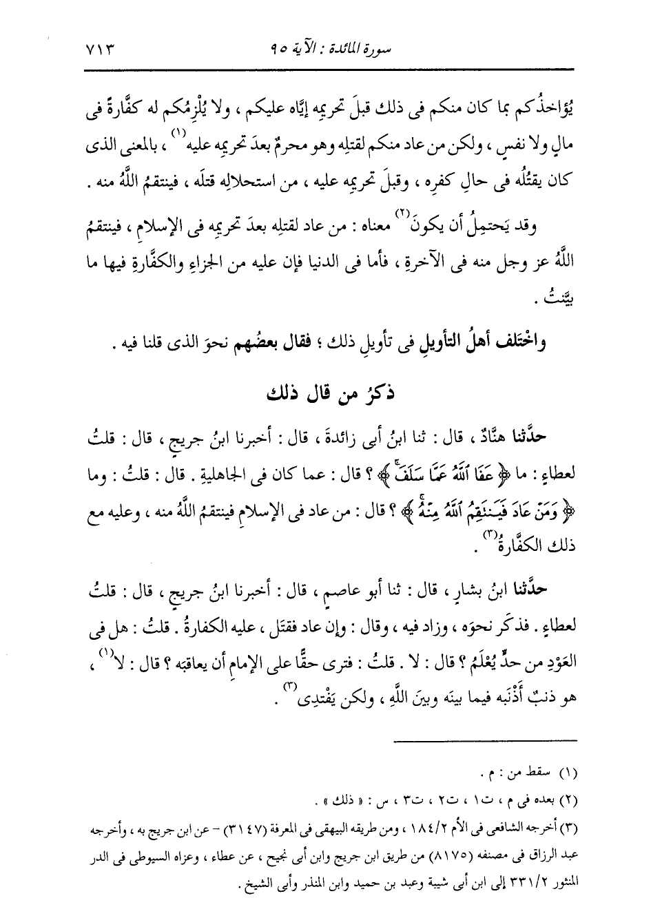 ذِكْرُ مَنْ قَالَ ذَلِكَ حَدَّثَنَا هَنَّادٌ، قَالَ: ثنا ابْنُ أَبِي زَائِدَةَ، قَالَ: أَخْبَرَنَا ابْنُ جُرَيْجٍ، قَالَ: قُلْتُ لِعَطَاءٍ: مَا {عَفَا اللَّهُ عَمَّا سَلَفَ} [المائدة: 95] ؟ قَالَ: " §عَمَّا كَانَ فِي الْجَاهِلِيَّةِ، قَالَ: قُلْتُ: وَمَا {وَمَنْ عَادَ فَيَنْتَقِمُ اللَّهُ مِنْهُ} [المائدة: 95] ؟ قَالَ: مَنْ عَادَ فِي الْإِسْلَامِ، فَيَنْتَقِمُ اللَّهُ مِنْهُ، وَعَلَيْهِ مَعَ ذَلِكَ الْكَفَّارَةُ "