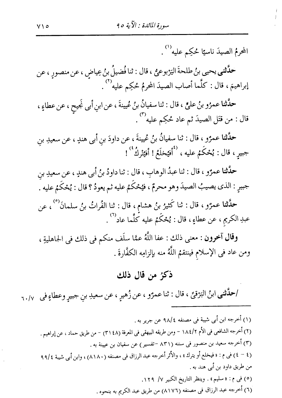 ذِكْرُ مَنْ قَالَ ذَلِكَ حَدَّثَنِي ابْنُ الْبَرْقِيِّ، قَالَ: ثنا عَمْرٌو، عَنْ زُهَيْرٍ، عَنْ سَعِيدِ بْنِ جُبَيْرٍ، وَعَطَاءٍ، فِي -[716]- قَوْلِ اللَّهِ تَعَالَى: {وَمَنْ عَادَ فَيَنْتَقِمُ اللَّهُ مِنْهُ} [المائدة: 95] قَالَا: " §يَنْتَقِمُ اللَّهُ، يَعْنِي بِالْجَزَاءِ. {عَفَا اللَّهُ عَمَّا سَلَفَ} [المائدة: 95] فِي الْجَاهِلِيَّةِ " وَقَالَ آخَرُونَ فِي ذَلِكَ: عَفَا اللَّهُ عَمَّا سَلَفَ مِنْ قَتْلِ مَنْ قَتَلَ مِنْكُمُ الصَّيْدَ حَرَامًا فِي أَوَّلِ مَرَّةٍ، وَمَنْ عَادَ ثَانِيَةً لِقَتْلِهِ بَعْدَ أُولَى حَرَامًا، فَاللَّهُ وَلِيُّ الِانْتِقَامِ مِنْهُ دُونَ كَفَّارَةٍ تَلْزَمُهُ لِقَتْلِهِ إِيَّاهُ