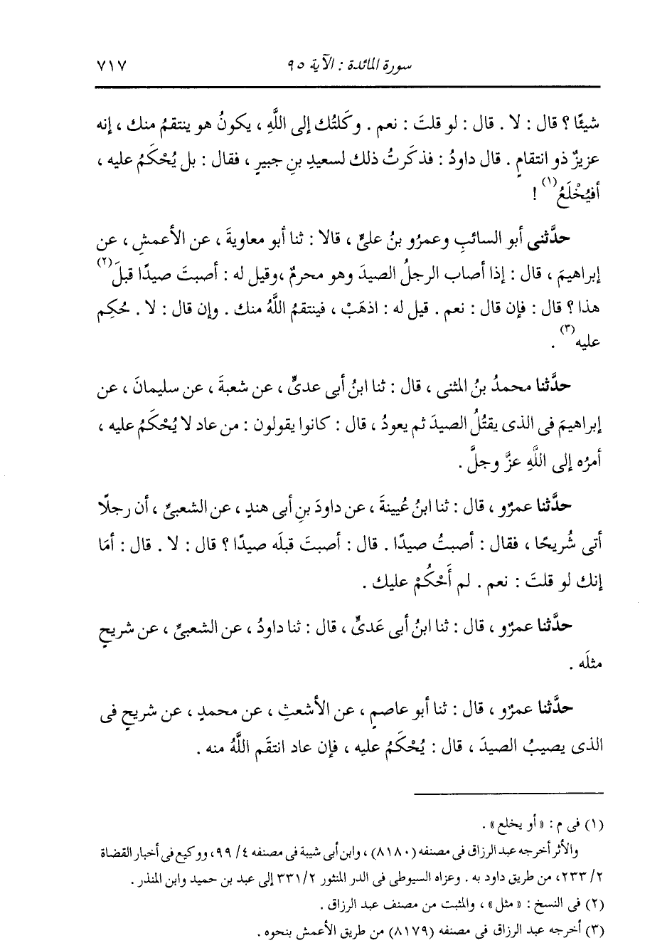 حَدَّثَنَا عَمْرٌو قَالَ: ثنا أَبُو عَاصِمٍ، عَنِ الْأَشْعَثِ، عَنْ مُحَمَّدٍ، عَنْ شُرَيْحٍ فِي الَّذِي يُصِيبُ الصَّيْدَ، قَالَ: «§يُحْكَمُ عَلَيْهِ، فَإِنْ عَادَ انْتَقَمَ اللَّهُ مِنْهُ»