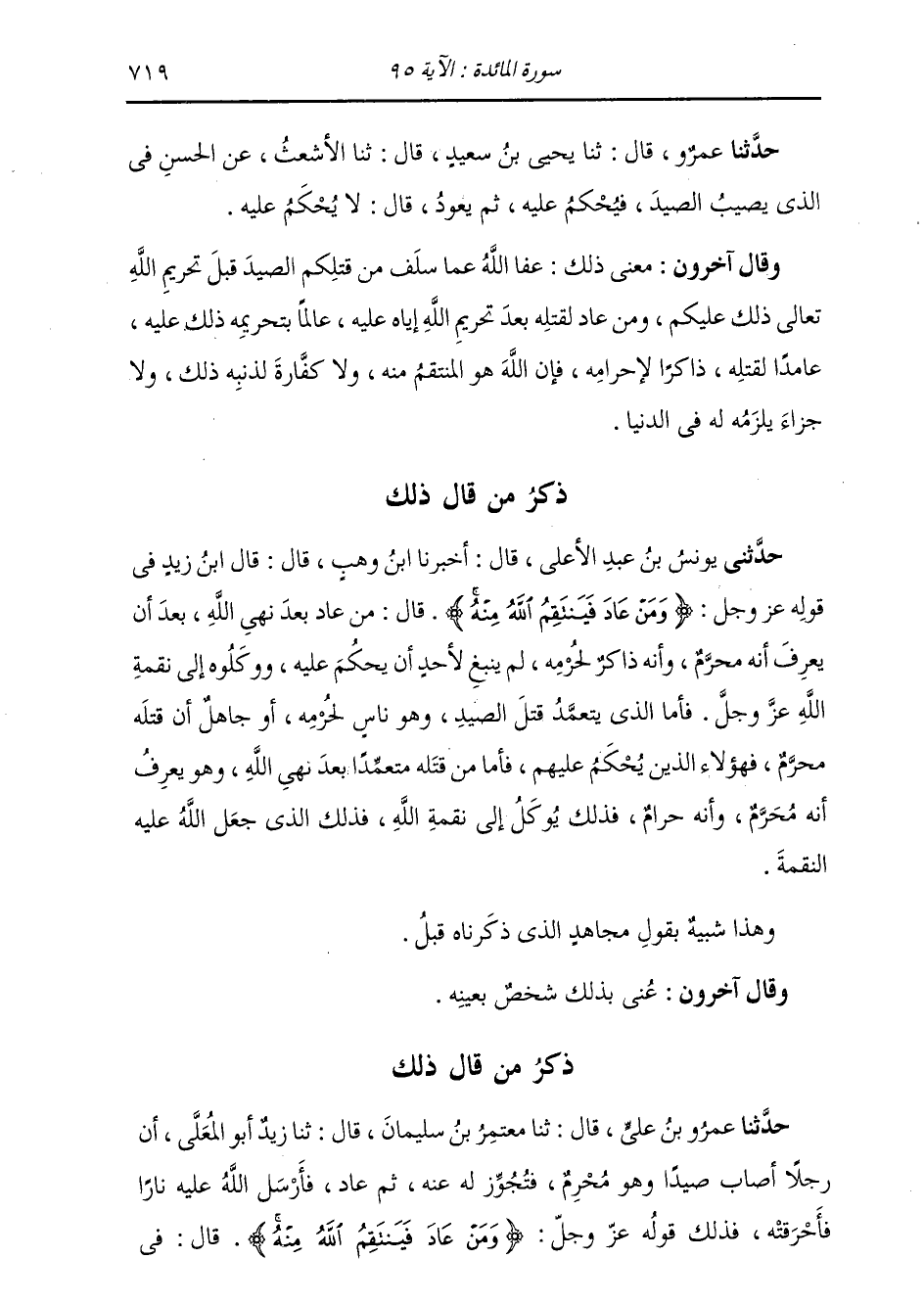 حَدَّثَنَا عَمْرٌو، قَالَ: ثنا يَحْيَى بْنُ سَعِيدٍ، قَالَ: ثنا الْأَشْعَثُ، عَنِ الْحَسَنِ، فِي الَّذِي يُصِيبُ الصَّيْدَ فَيُحْكَمُ عَلَيْهِ ثُمَّ يَعُودُ، قَالَ: «§لَا يُحْكَمُ عَلَيْهِ» وَقَالَ آخَرُونَ: مَعْنَى ذَلِكَ عَفَا اللَّهُ عَمَّا سَلَفَ مِنْ قَتْلِكُمُ الصَّيْدَ قَبْلَ تَحْرِيمِ اللَّهِ تَعَالَى ذَلِكَ عَلَيْكُمْ، وَمَنْ عَادَ لِقَتْلِهِ بَعْدَ تَحْرِيمِ اللَّهِ إِيَّاهُ عَلَيْهِ عَالِمًا بِتَحْرِيمِهِ ذَلِكَ عَلَيْهِ، عَامِدًا لِقَتْلِهِ، ذَاكِرًا لِإِحْرَامِهِ، فَإِنَّ اللَّهَ هُوَ الْمُنْتَقِمُ مِنْهُ، وَلَا كَفَّارَةَ لِذَنْبِهِ ذَلِكَ، وَلَا جَزَاءَ يَلْزَمُهُ لَهُ فِي الدُّنْيَا