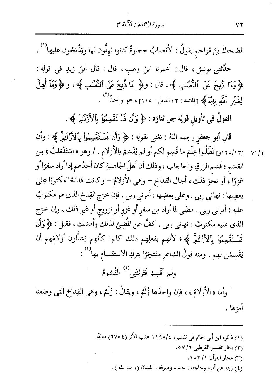 §الْقَوْلُ فِي تَأْوِيلِ قَوْلِهِ: {وَأَنْ تَسْتَقْسِمُوا بِالْأَزْلَامِ} [المائدة: 3] يَعْنِي بِقَوْلِهِ: {وَأَنْ تَسْتَقْسِمُوا بِالْأَزْلَامِ} [المائدة: 3] وَأَنْ تَطْلُبُوا عِلْمَ مَا قُسِمَ لَكُمْ أَوْ لَمْ يُقْسَمْ , بِالْأَزْلَامِ. وَهُوَ اسْتَفْعَلْتُ مِنَ الْقَسْمِ: قَسْمِ الرِّزْقِ وَالْحَاجَاتِ. وَذَلِكَ أَنَّ أَهْلَ الْجَاهِلِيَّةِ كَانَ أَحَدُهُمْ إِذَا أَرَادَ سَفَرًا أَوْ غَزْوًا أَوْ نَحْوَ ذَلِكَ , أَجَالَ الْقِدَاحَ , وَهِيَ الْأَزْلَامُ , وَكَانَتْ قِدَاحًا مَكْتُوبًا عَلَى بَعْضِهَا: نَهَانِي رَبِّي , وَعَلَى بَعْضِهَا: أَمَرَنِي رَبِّي , فَإِنْ خَرَجَ الْقَدَحُ الَّذِي هُوَ مَكْتُوبٌ عَلَيْهِ: أَمَرَنِي رَبِّي , مَضَى لِمَا أَرَادَ مِنْ سَفَرٍ أَوْ غَزْو أَوْ تَزْوِيجٍ وَغَيْرِ ذَلِكَ؛ وَإِنْ خَرَجَ الَّذِي عَلَيْهِ مَكْتُوبٌ: نَهَانِي رَبِّي , كَفَّ عَنِ الْمُضِيِّ لِذَلِكَ وَأَمْسَكَ فَقِيلَ: {وَأَنْ تَسْتَقْسِمُوا بِالْأَزْلَامِ} [المائدة: 3] لِأَنَّهُمْ بِفِعْلِهِمْ ذَلِكَ كَانُوا كَأَنَّهُمْ يَسْأَلُونَ أَزْلَامَهُمْ أَنْ يَقْسِمْنَ لَهُمْ. وَمِنْهُ قَوْلُ الشَّاعِرِ مُفْتَخِرًا بِتَرْكِ الِاسْتِقْسَامِ بِهَا: