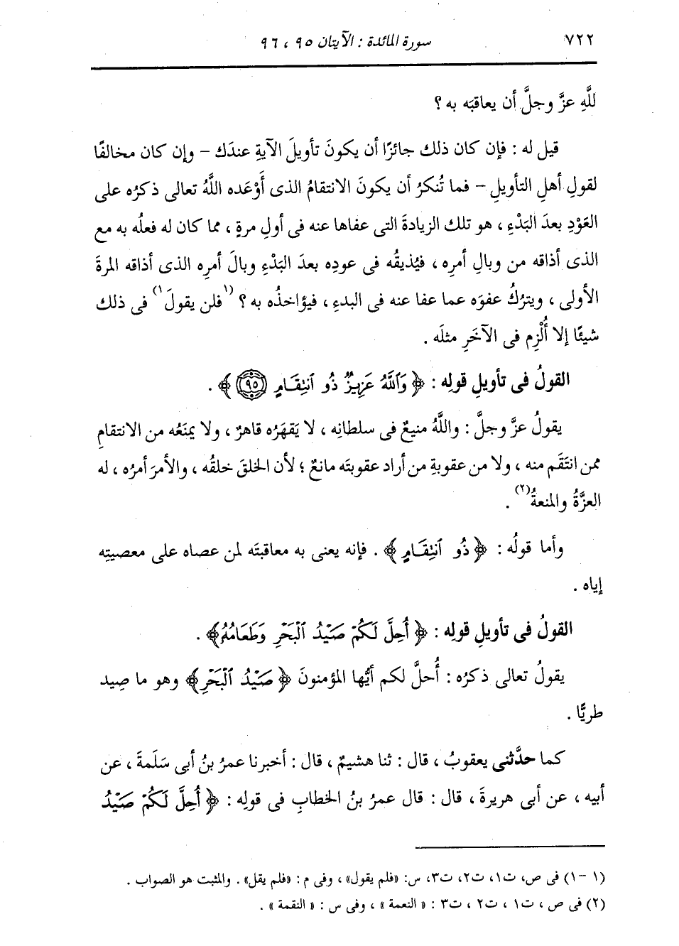§الْقَوْلُ فِي تَأْوِيلِ قَوْلِهِ تَعَالَى: {أُحِلَّ لَكُمْ صَيْدُ الْبَحْرِ وَطَعَامُهُ مَتَاعًا لَكُمْ وَلِلسَّيَّارَةِ وَحُرِّمَ عَلَيْكُمْ صَيْدُ الْبَرِّ مَا دُمْتُمْ حُرُمًا وَاتَّقُوا اللَّهَ الَّذِيَ إِلَيْهِ تُحْشَرُونَ} [المائدة: 96] . يَقُولُ تَعَالَى ذِكْرُهُ: {أُحِلَّ لَكُمْ} [البقرة: 187] أَيُّهَا الْمُؤْمِنُونَ {صَيْدُ الْبَحْرِ} [المائدة: 96] ، وَهُوَ مَا صِيدَ طَرِيًّا