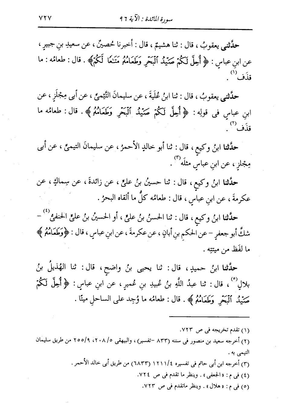 حَدَّثَنِي يَعْقُوبُ قَالَ: ثنا ابْنُ عُلَيَّةَ، عَنْ سُلَيْمَانَ التَّيْمِيِّ، عَنْ أَبِي مِجْلَزٍ، عَنِ ابْنِ عَبَّاسٍ، فِي قَوْلِهِ: {أُحِلَّ لَكُمْ صَيْدُ الْبَحْرِ وَطَعَامُهُ} [المائدة: 96] قَالَ: " §طَعَامُهُ: مَا قَذَفَ " حَدَّثَنَا ابْنُ وَكِيعٍ قَالَ: ثنا أَبُو خَالِدٍ الْأَحْمَرُ، عَنْ سُلَيْمَانَ التَّيْمِيِّ، عَنْ أَبِي مِجْلَزٍ، عَنِ ابْنِ عَبَّاسٍ، مِثْلَهُ