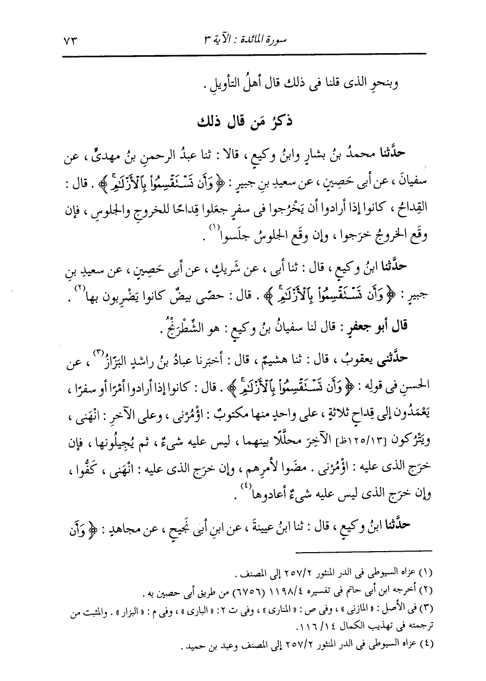 ذِكْرُ مَنْ قَالَ ذَلِكَ: حَدَّثَنَا مُحَمَّدُ بْنُ بَشَّارٍ , وَابْنُ وَكِيعٍ , قَالَا: ثنا عَبْدُ الرَّحْمَنِ بْنُ مَهْدِيٍّ , عَنْ سُفْيَانَ , عَنْ أَبِي حُصَيْنٍ , عَنْ سَعِيدِ بْنِ جُبَيْرٍ: {§وَأَنْ تَسْتَقْسِمُوا بِالْأَزْلَامِ} [المائدة: 3] قَالَ: «الْقِدَاحُ , كَانُوا إِذَا أَرَادُوا أَنْ يَخْرُجُوا فِي سَفَرٍ , جَعَلُوا قِدَاحًا لِلْجُلُوسِ وَالْخُرُوجِ , فَإِنْ وَقَعَ الْخُرُوجُ خَرَجُوا , وَإِنْ وَقَعَ الْجُلُوسُ جَلَسُوا»