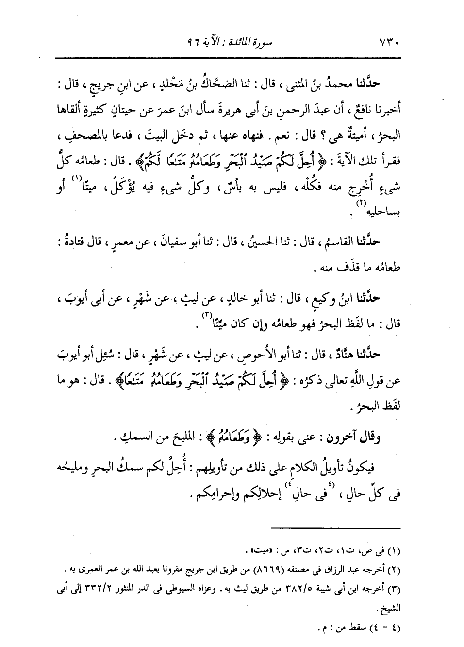 حَدَّثَنَا هَنَّادٌ، قَالَ: ثنا أَبُو الْأَحْوَصِ، عَنْ لَيْثٍ، عَنْ شَهْرٍ، قَالَ: سُئِلَ أَبُو أَيُّوبَ عَنْ قَوْلِ اللَّهِ، تَعَالَى: {أُحِلَّ لَكُمْ صَيْدُ الْبَحْرِ وَطَعَامُهُ مَتَاعًا} [المائدة: 96] ، قَالَ: «§هُوَ مَا لَفَظَ الْبَحْرُ» وَقَالَ آخَرُونَ: عَنَى بِقَوْلِهِ: {وَطَعَامُهُ} [المائدة: 96] الْمَلِيحَ مِنَ السَّمَكِ فَيَكُونُ تَأْوِيلُ الْكَلَامِ عَلَى ذَلِكَ مِنْ تَأْوِيلِهِمْ: أُحِلَّ لَكُمْ سَمَكُ الْبَحْرِ وَمَلِيحُهُ فِي كُلِّ حَالٍ، إِحْلَالَكُمْ وَإِحْرَامَكُمْ