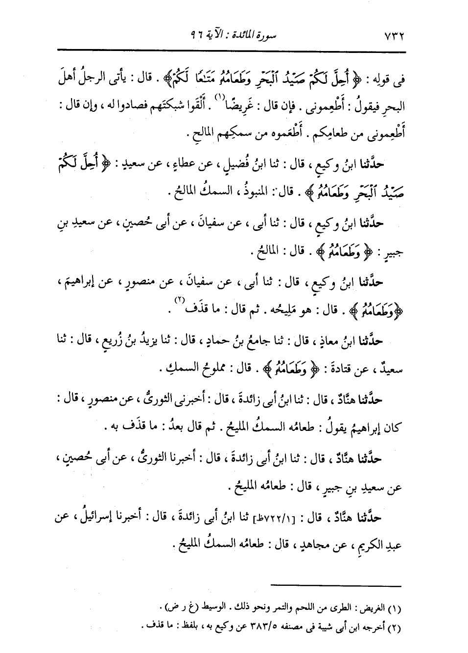 حَدَّثَنَا ابْنُ وَكِيعٍ قَالَ: ثنا أَبِي، عَنْ سُفْيَانَ، عَنْ أَبِي حَصِينٍ، عَنْ سَعِيدِ بْنِ جُبَيْرٍ: {وَطَعَامُهُ} [المائدة: 96] ، قَالَ: «§الْمَالِحُ»