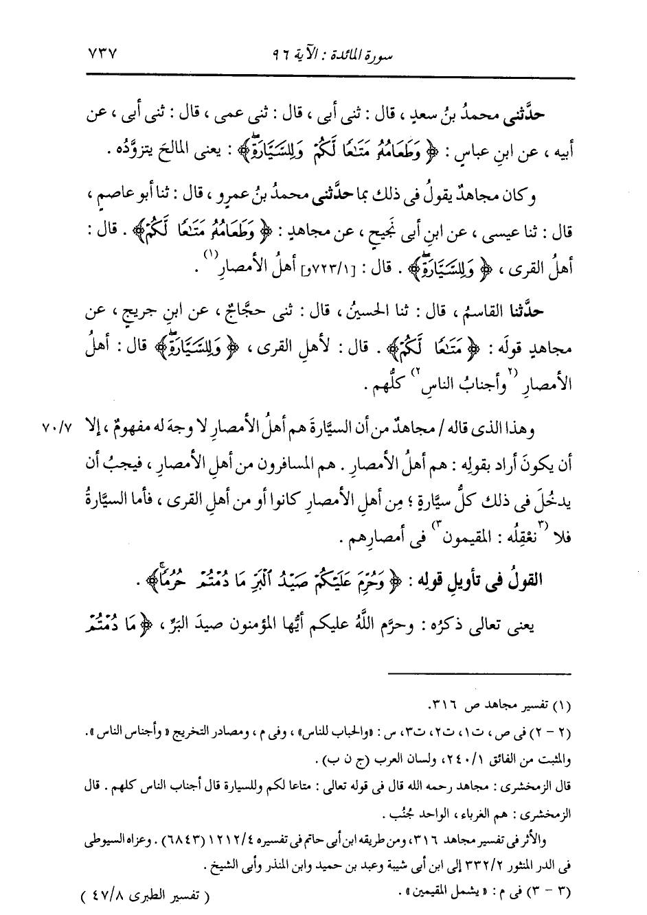 حَدَّثَنَا الْقَاسِمُ قَالَ: ثنا الْحُسَيْنُ قَالَ: ثني حَجَّاجٌ، عَنِ ابْنِ جُرَيْجٍ، عَنْ مُجَاهِدٍ، قَوْلُهُ: {مَتَاعًا لَكُمْ} [المائدة: 96] قَالَ: " §لِأَهْلِ الْقُرَى، {وَلِلسَّيَّارَةِ} [المائدة: 96] قَالَ: أَهْلُ الْأَمْصَارِ وَأَجْنَاسُ النَّاسِ كُلِّهِمْ " وَهَذَا الَّذِي قَالَهُ مُجَاهِدٌ مِنْ أَنَّ السَّيَّارَةَ هُمْ أَهْلُ الْأَمْصَارِ لَا وَجْهَ لَهُ مَفْهُومٌ، إِلَّا أَنْ يَكُونَ أَرَادَ بِقَوْلِهِ هُمْ أَهْلُ الْأَمْصَارِ: هُمُ الْمُسَافِرُونَ مِنْ أَهْلِ الْأَمْصَارِ، فَيَجِبُ أَنْ يَدْخُلَ فِي ذَلِكَ كُلُّ سَيَّارَةٍ مِنْ أَهْلِ الْأَمْصَارِ كَانُوا أَوْ مِنْ أَهْلِ الْقُرَى، فَأَمَّا السَّيَّارَةُ فَلَا يَشْمَلُ الْمُقِيمِينَ فِي أَمْصَارِهِمْ