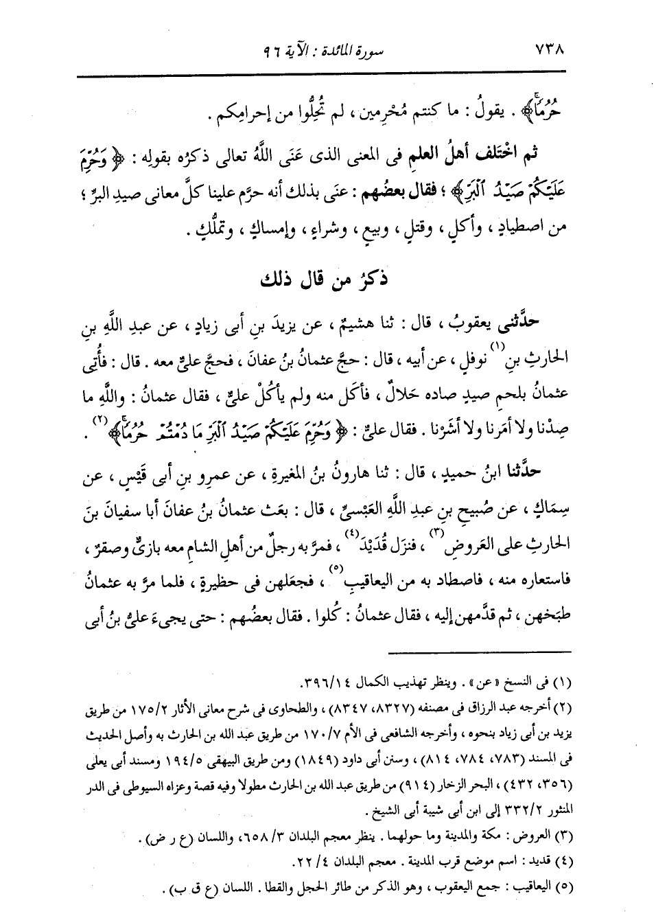 ذِكْرُ مَنْ قَالَ ذَلِكَ حَدَّثَنِي يَعْقُوبُ، قَالَ: ثنا هُشَيْمٌ، عَنْ يَزِيدَ بْنِ أَبِي زِيَادٍ، عَنْ عَبْدِ اللَّهِ بْنِ الْحَارِثِ، عَنْ نَوْفَلٍ، عَنْ أَبِيهِ، قَالَ: حَجَّ عُثْمَانُ بْنُ عَفَّانَ، فَحَجَّ عَلِيُّ مَعَهُ. قَالَ: فَأُتِيَ عُثْمَانُ بِلَحْمِ صَيْدٍ صَادَهُ حَلَالٌ، فَأَكَلَ مِنْهُ وَلَمْ يَأْكُلْ عَلِيُّ، فَقَالَ عُثْمَانُ: وَاللَّهِ مَا صِدْنَا وَلَا أَمَرْنَا وَلَا أَشَرْنَا، فَقَالَ عَلِيُّ: {§وَحُرِّمَ عَلَيْكُمْ صَيْدُ الْبَرِّ مَا دُمْتُمْ حُرُمًا} [المائدة: 96]