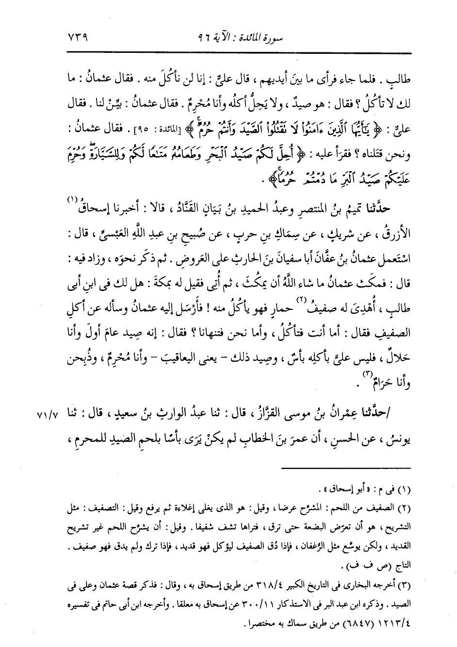 حَدَّثَنَا تَمِيمُ بْنُ الْمُنْتَصِرِ، وَعَبْدُ الْحَمِيدِ بْنُ بَيَانٍ الْقَنَّادُ، قَالَا: أَخْبَرَنَا أَبُو إِسْحَاقَ الْأَزْرَقُ، عَنْ شَرِيكٍ، عَنْ سِمَاكِ بْنِ حَرْبٍ، عَنْ صُبَيْحِ بْنِ عُبَيْدِ اللَّهِ الْعَبْسِيِّ، قَالَ: اسْتَعْمَلَ عُثْمَانُ بْنُ عَفَّانَ أَبَا سُفْيَانَ بْنَ الْحَارِثِ عَلَى الْعُرُوضِ. ثُمَّ ذَكَرَ نَحْوَهُ، وَزَادَ فِيهِ قَالَ: فَمَكَثَ عُثْمَانُ مَا شَاءَ اللَّهُ أَنْ يَمْكُثَ، ثُمَّ أُتِيَ فَقِيلَ لَهُ بِمَكَّةَ: هَلْ لَكَ فِي ابْنِ أَبِي طَالِبٍ، أُهْدِيَ لَهُ صَفِيفُ حِمَارٍ فَهُوَ يَأْكُلُ مِنْهُ، فَأَرْسَلَ إِلَيْهِ عُثْمَانُ وَسَأَلَهُ عَنْ أَكْلِ الصَّفِيفِ، فَقَالَ: أَمَّا أَنْتَ فَتَأْكُلُ، وَأَمَّا نَحْنُ فَتَنْهَانَا؟ فَقَالَ: §إِنَّهُ صِيدَ عَامَ أَوَّلٍ، وَأَنَا حَلَالٌ، فَلَيْسَ عَلَيَّ بِأَكْلِهِ بَأْسٌ، وَصِيدَ ذَلِكَ يَعْنِي الْيَعَاقِيبَ وَأَنَا مُحْرِمٌ، وَذُبِحْنَ وَأَنَا حَرَامٌ "