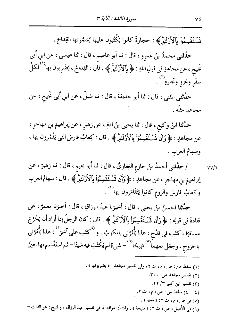 حَدَّثَنِي أَحْمَدُ بْنُ حَازِمٍ الْغِفَارِيُّ , قَالَ: ثنا أَبُو نُعَيْمٍ , قَالَ: ثنا زُهَيْرٌ , عَنْ إِبْرَاهِيمَ بْنِ مُهَاجِرٍ , عَنْ مُجَاهِدٍ: {§وَأَنْ تَسْتَقْسِمُوا بِالْأَزْلَامِ} [المائدة: 3] قَالَ: «سِهَامُ الْعَرَبِ وَكِعَابُ فَارِسٍ وَالرُّومِ كَانُوا يَتَقَامَرُونَ بِهَا»